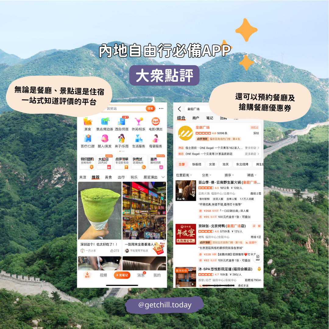 2. 大眾點評:無論是餐廳、景點還是住宿一站式知道評價的平台,還可以預約餐廳及搶購餐廳優惠券