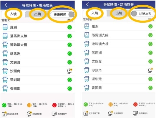 ,港鐵指羅湖落馬洲人多呼籲採用其他口岸,但連深圳灣和港珠澳大橋也逼爆。其實旅客可瀏覽入境處網頁www.immd.gov.hk,查看各邊境管制站的繁忙時間。此外,市民及旅客亦可透過入境處流動應用程式隨時隨地查閱各陸路邊境管制站的估計輪候過關狀況,以便計劃行程及減省排隊時間。