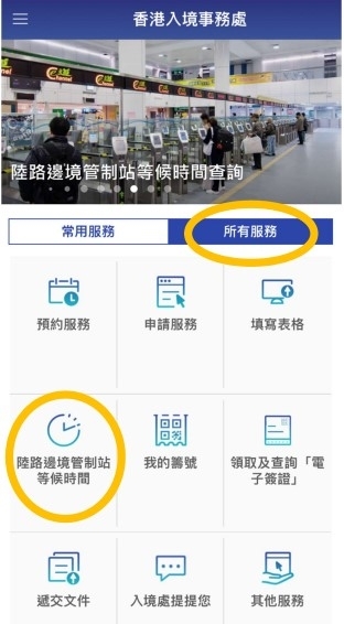 3) 選擇「所有服務」,再選擇「陸路邊境管制站等候時間」