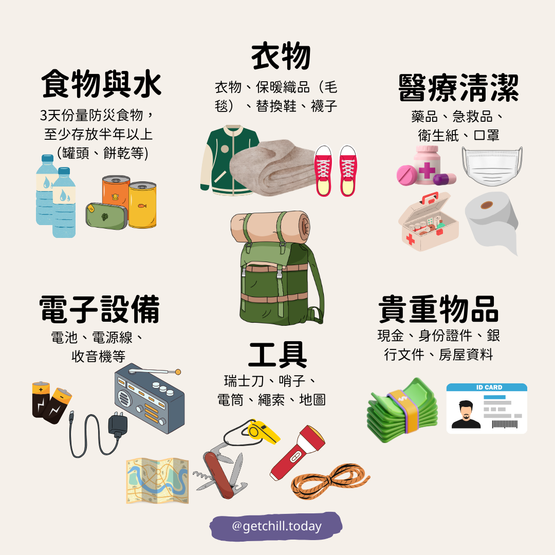 參考資料:日本「非常用持出袋」、台灣內政部消防署