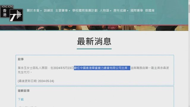中國香港舉重健力總會今(24 日)宣佈,葉永玉因私人原因昨日辭任主席一職,主席職務由第一副主席余森波代行。港協暨奧委會表示,已接獲通知,即時生效,又指尊重總會及葉永玉的決定。![]()