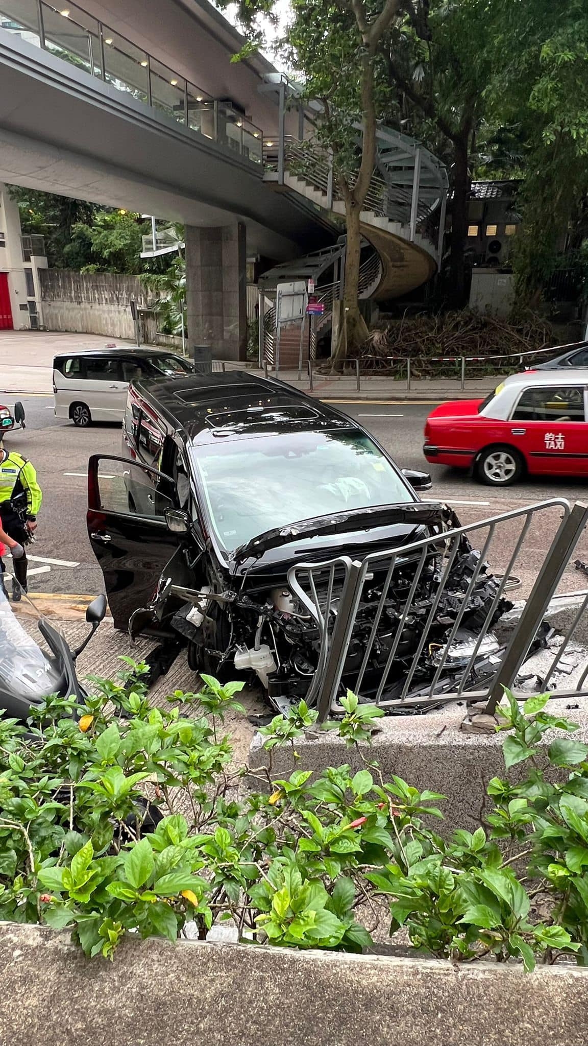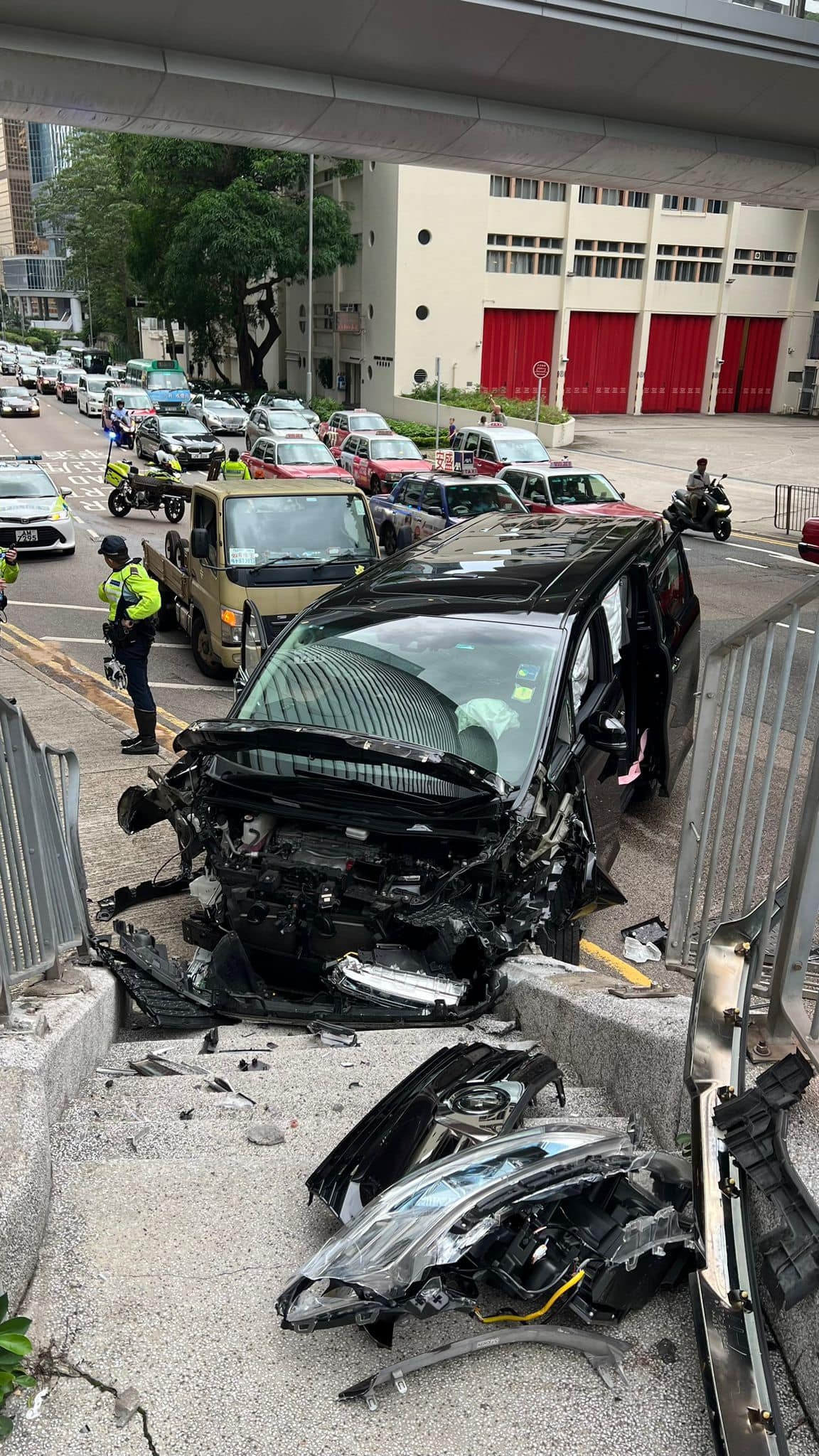 今日(13日)下午近5時,中環紅棉路上山方向近中區消防局位置,一部七人車疑失控自炒鏟上行人路,掃毀約10米欄杆。網傳圖片見到,七人車車頭盡毀,泵把飛脫,安全氣袋彈出,行人路樓梯石塊亦被撞至崩裂。所幸司機受輕傷,車禍原因仍在調查。意外期間,現場部份行車線封閉,現已解封,但 車龍有待消散。