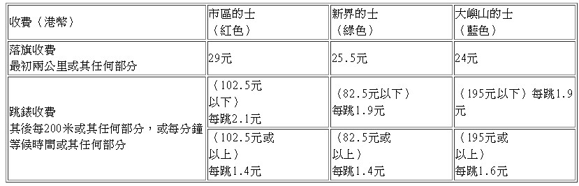 運輸署今日(七月十三日)宣布,巿區、新界及大嶼山的士新收費將由明日(七月十四日)起生效。詳情如下: