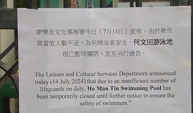 康樂及文化事務署今日(七月十四日)宣布,由於救生員當值人數不足,為保障泳客安全,九龍城區何文田游泳池現已暫時關閉,直至另行通知。不少泳客慘吃閉門羹,假期大失預算,不少家長都不滿康文署的安排。