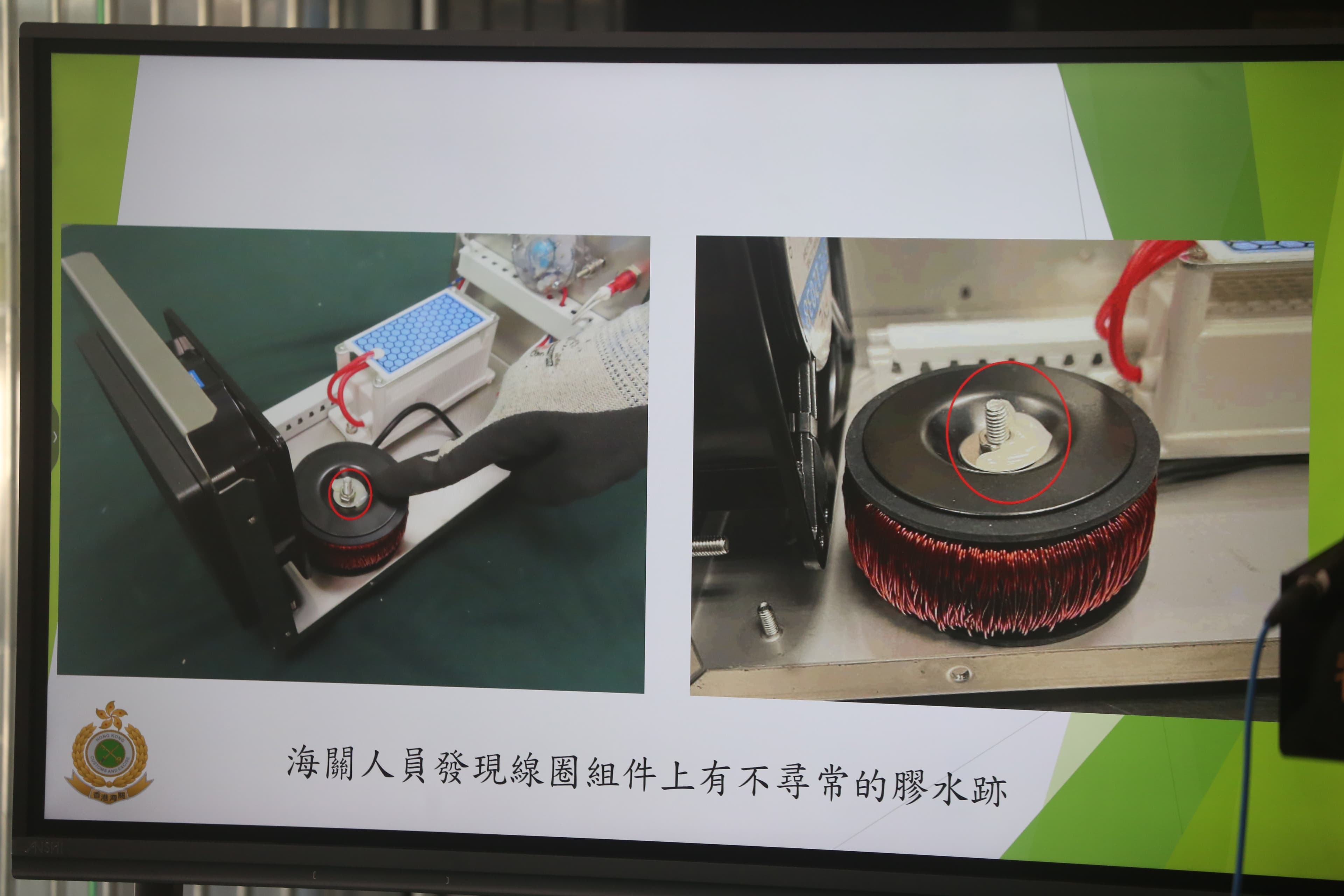 人員於是打開其中一部臭氧機,發現內裏的線圈組件上有不尋常的膠水迹,並根據X光影像分析的結果,針對密度最高的線圈組件作檢查,發現內裏核心是由一叠共11塊的金屬片組成,但這些金屬片的手感和顏色均有異,經逐塊磅重後,其中9塊重量異常,較其餘2塊金屬片重超過2倍,相信這些金屬片被人加工以作掩飾。