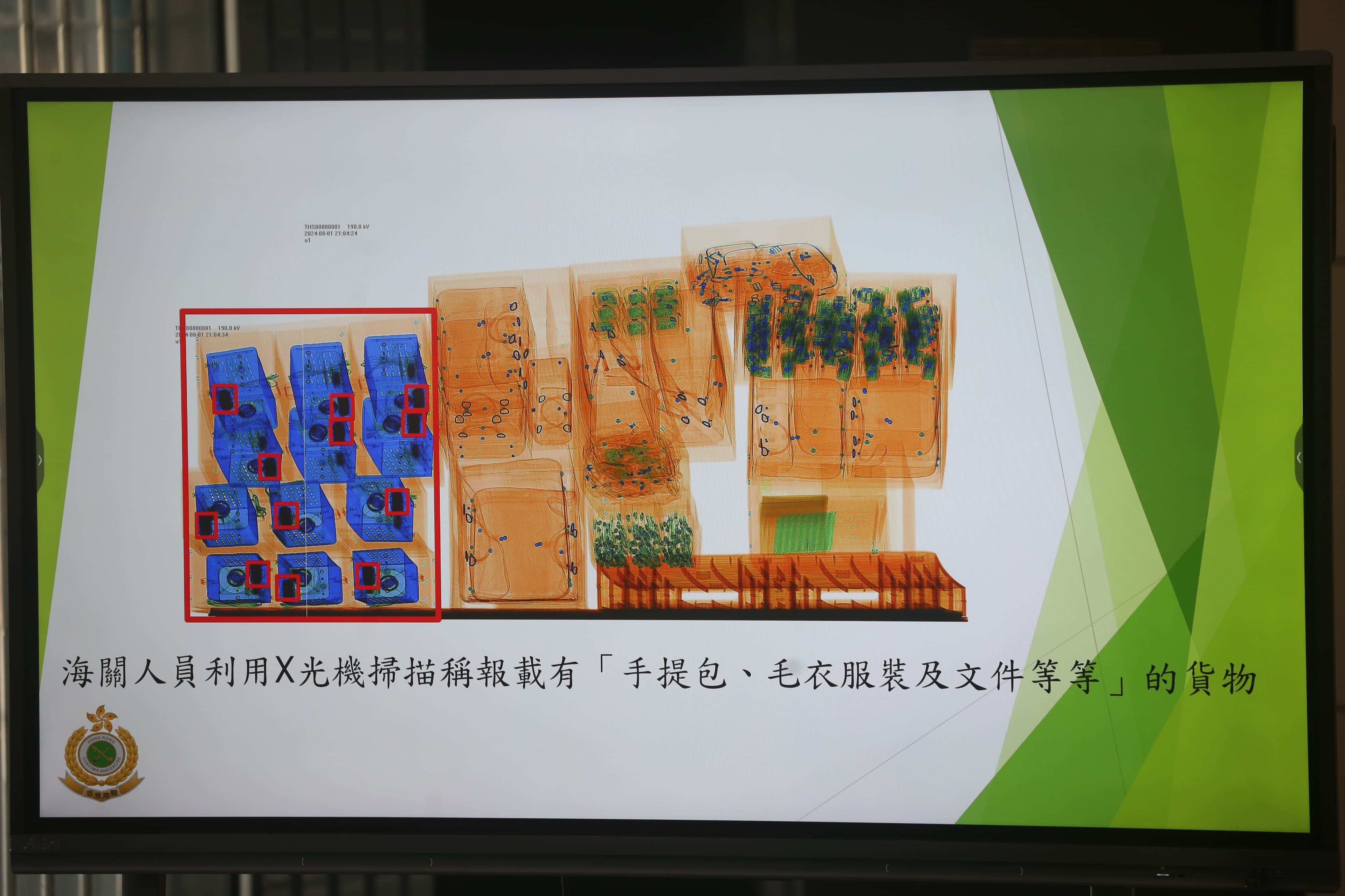 海關機場科人員在8月1日晚上,檢查一批由香港運往日本的空運貨物,貨物當時報稱載有手提包、毛衣服飾及文件等,共有14個紙箱,重127公斤。