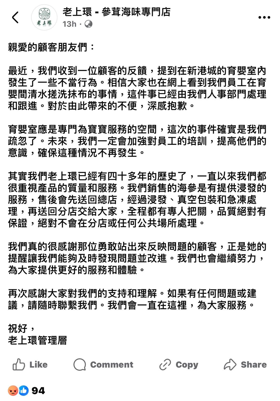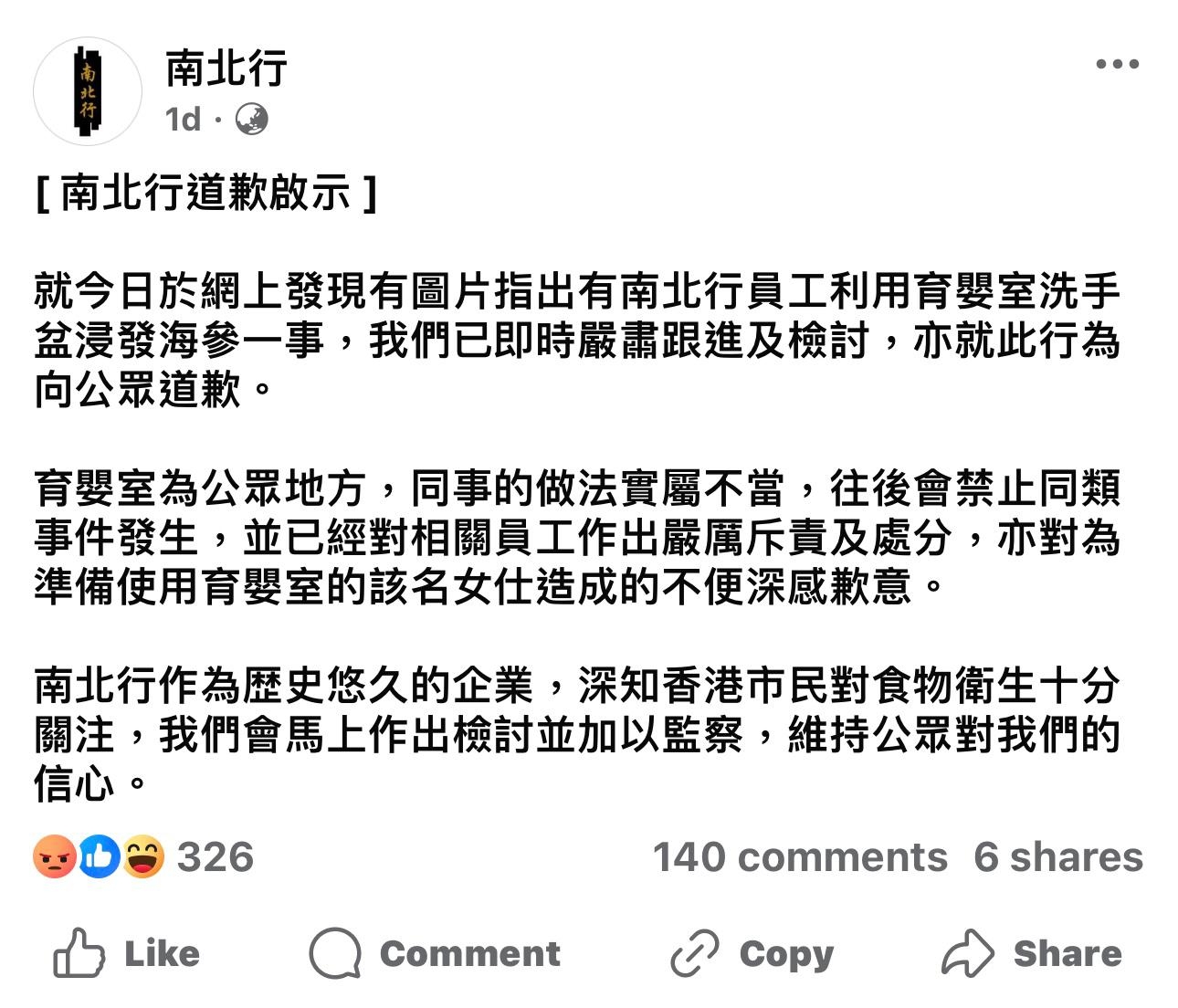 但事件仍持續發酵,最終「老上環」和「南北行」兩間店都在社交媒體上發文公開道歉,並已嚴厲斥責及處分涉事員工。