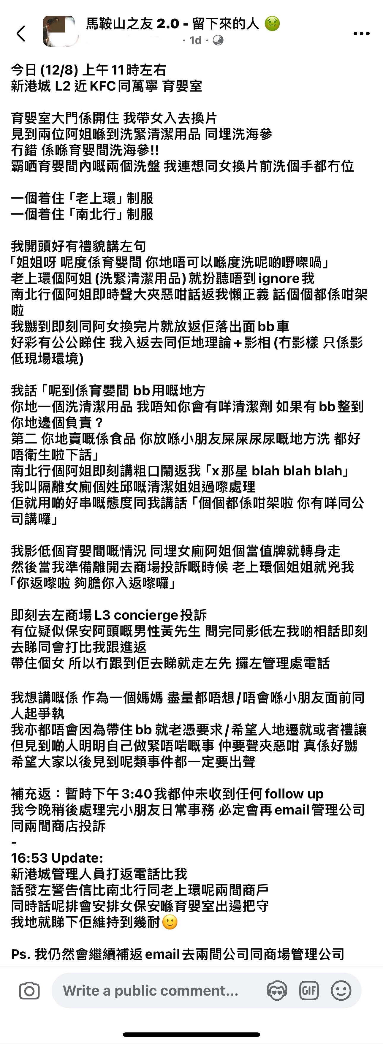 港媽後來更新帖文稱,已獲商場管理處回覆,「新港城管理人員打返電話比我,話發咗警告信比南北行同老上環呢兩間商戶,同時話呢排會安排女保安喺育嬰室出邊把守」。