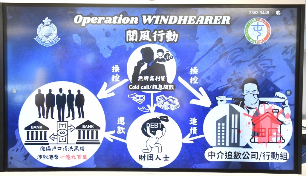 警方於日前於突擊搜查全港多個目標單位,以「串謀無牌放債」、「串謀過高利率放債」、「刑事恐嚇」、「刑事毁壞」及「洗黑錢」等罪合共拘捕13人,包括9男4女,年齡介乎14至66歲,當中有6人疑為傀儡戶口持有人,涉及金額約1.09億元,而年紀最小的疑犯則為一名學生。