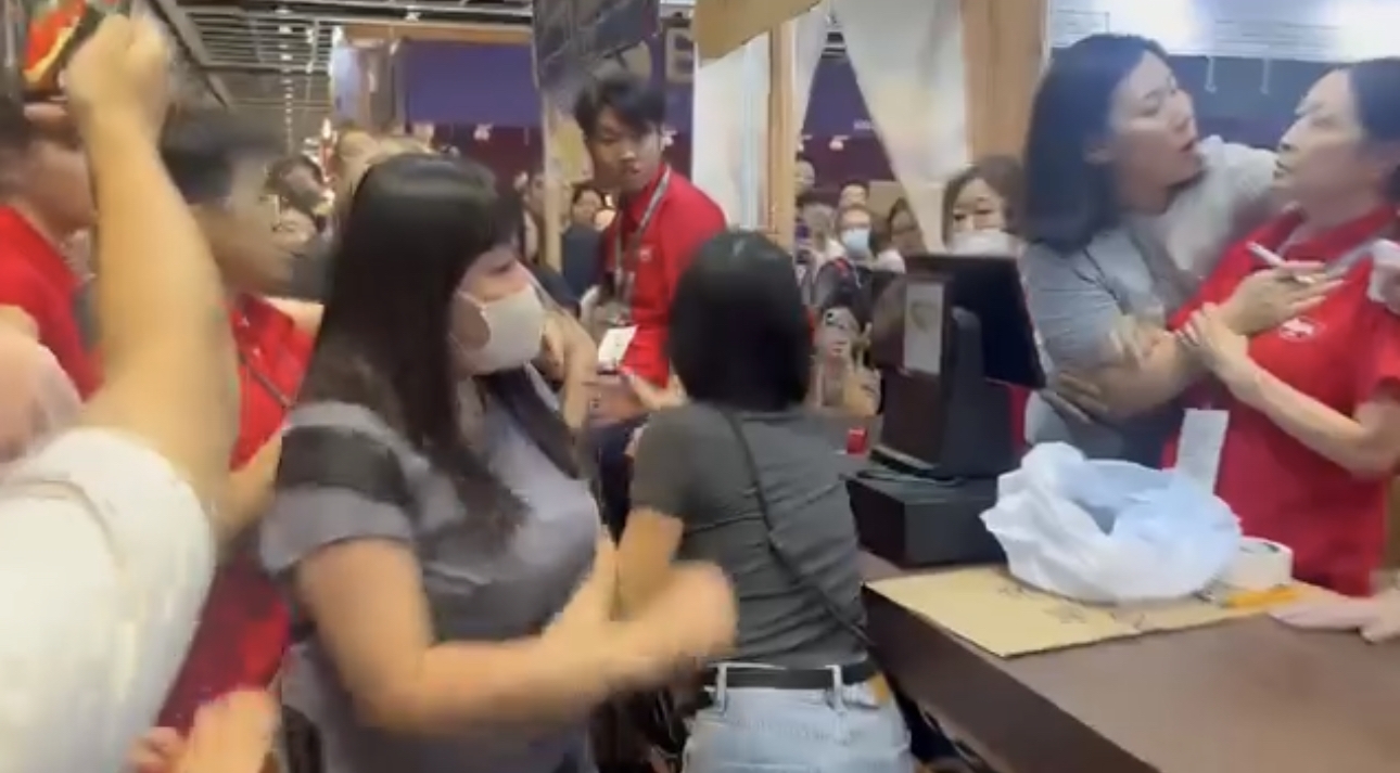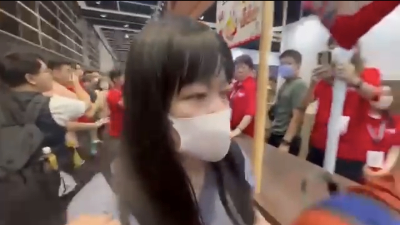 網上流傳的影片,一個出售福袋的日清攤位前人頭踴踴,其間一名女子突然拿起收銀機前的宣傳品牌子拍打桌面,攤位內一名職員聲稱遭對方襲擊,更一度情緒激動,需由其他職員安撫:「佢打我呀!佢做乜打我呀?」
