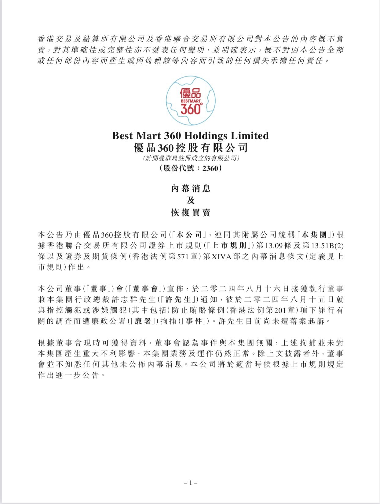 上周五(8月16日)短暫停牌的優品360(2360)昨日(8月18日)發出公告,指董事會於同日接獲執行董事兼集團行政總裁許志群通知,彼於上周四(15日)就與指控觸犯或涉嫌觸犯(其中包括)防止賄賂條例(香港法例第201章)項下罪行有關的調查而遭廉政公署拘捕。