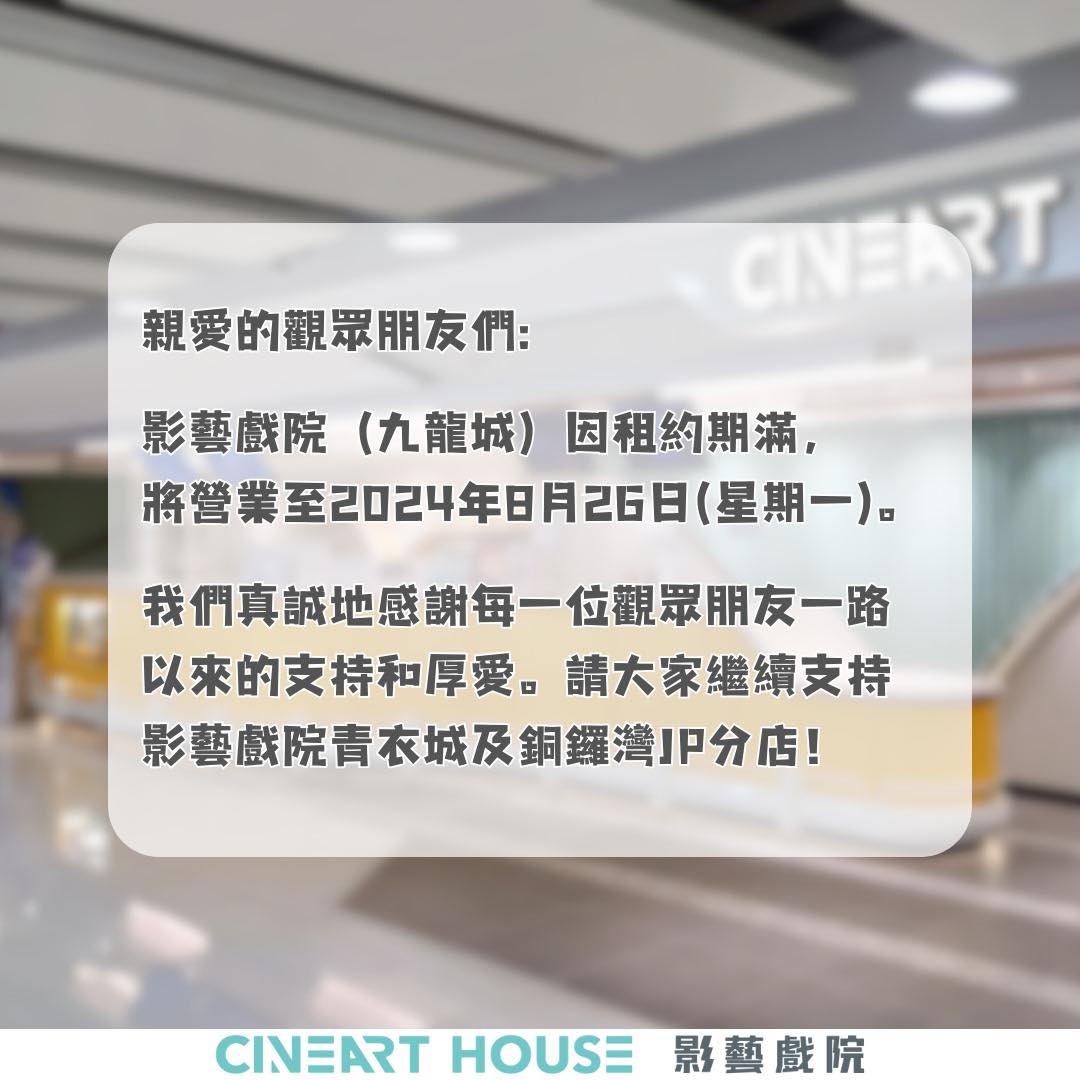 戲院結業潮持續。影藝戲院昨(8月20日)於社交媒體宣佈,由於租約期滿,位於九龍城廣場的影藝戲院(九龍城),將營業至下周一(8月26日)後結業。是今年第6間結業的戲院。![]()