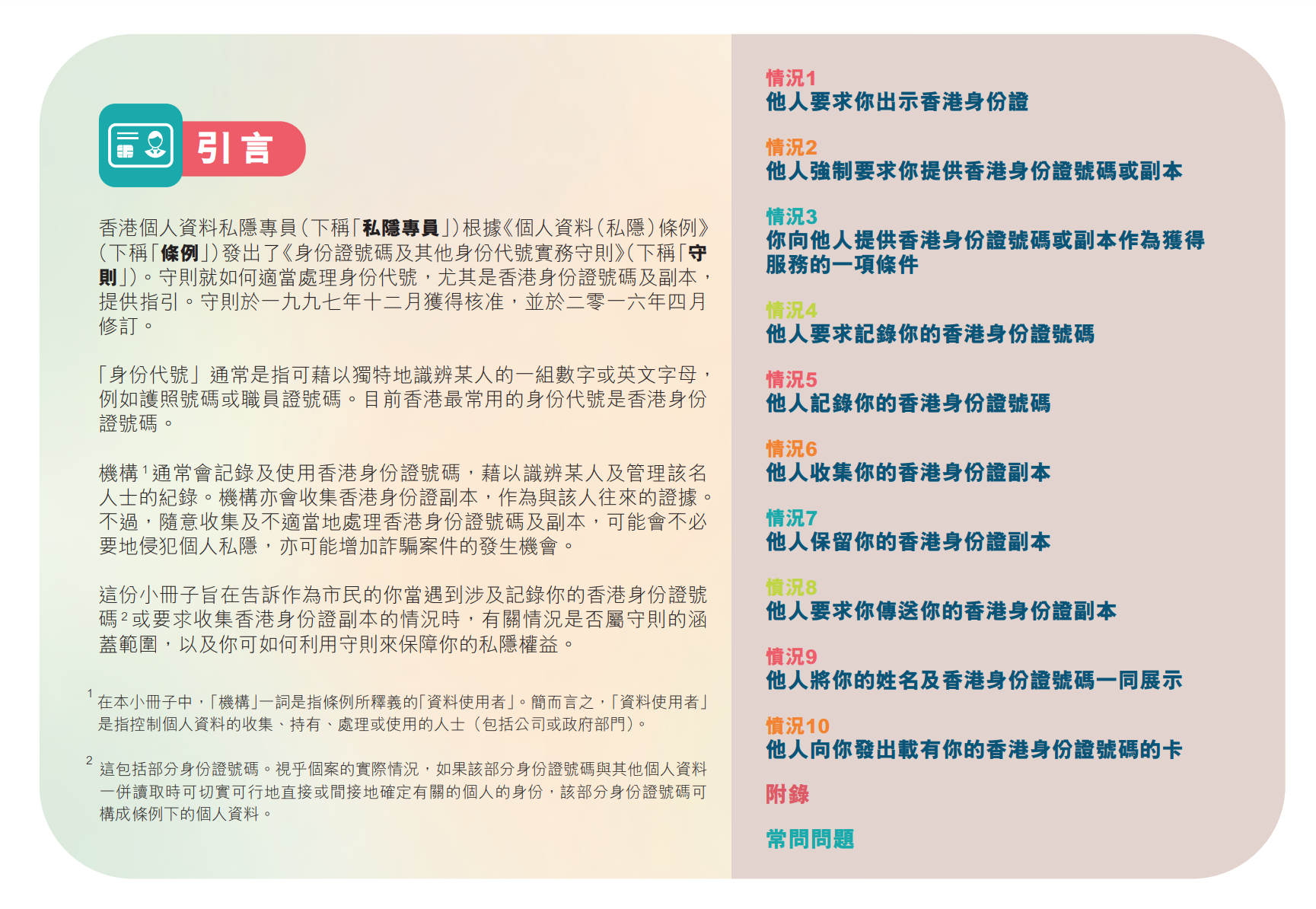 該些情境包括銀行、保險公司或地產代理就法定要求收集身份證副本、大廈保安員收集身份證號碼、準僱主何時可收集準僱員的身份證副本等。