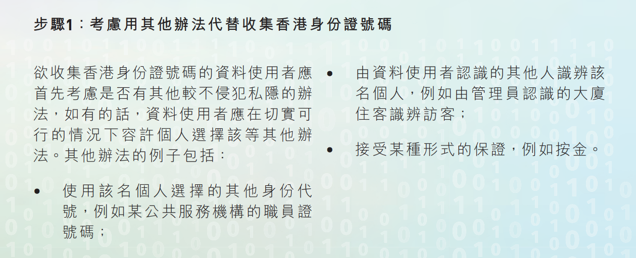 單張提及保安員會收集市民的香港身份證號碼的資料。保安員應首先考慮是否有其他較不侵犯私隱的辦法,應在可行情況下選用其他較不侵犯私隱的替代方法,如所屬公共服務機構簽發的志願證等。