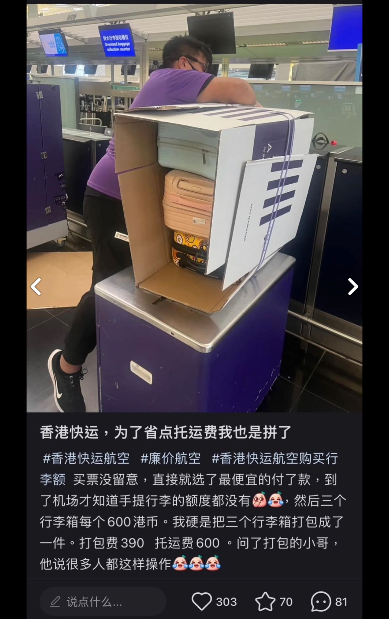 樓主在內文稱「買票沒留意,直接就選了最便宜的付了款,到了機場才知道手提行李的額度都沒有,然後三個行李箱每個600港幣。我硬是把三個行李箱打包成了一件。打包費390,托運費600。問了打包的小哥,他說很多人都這樣操作。」