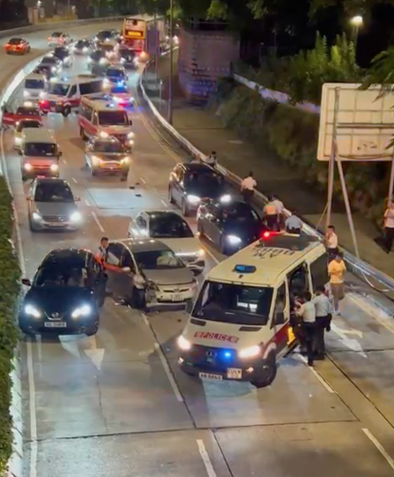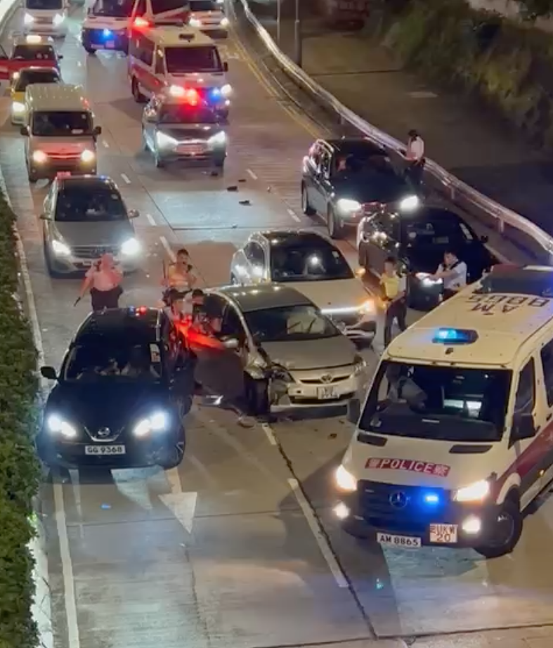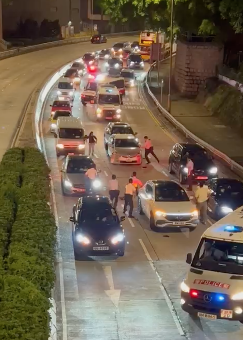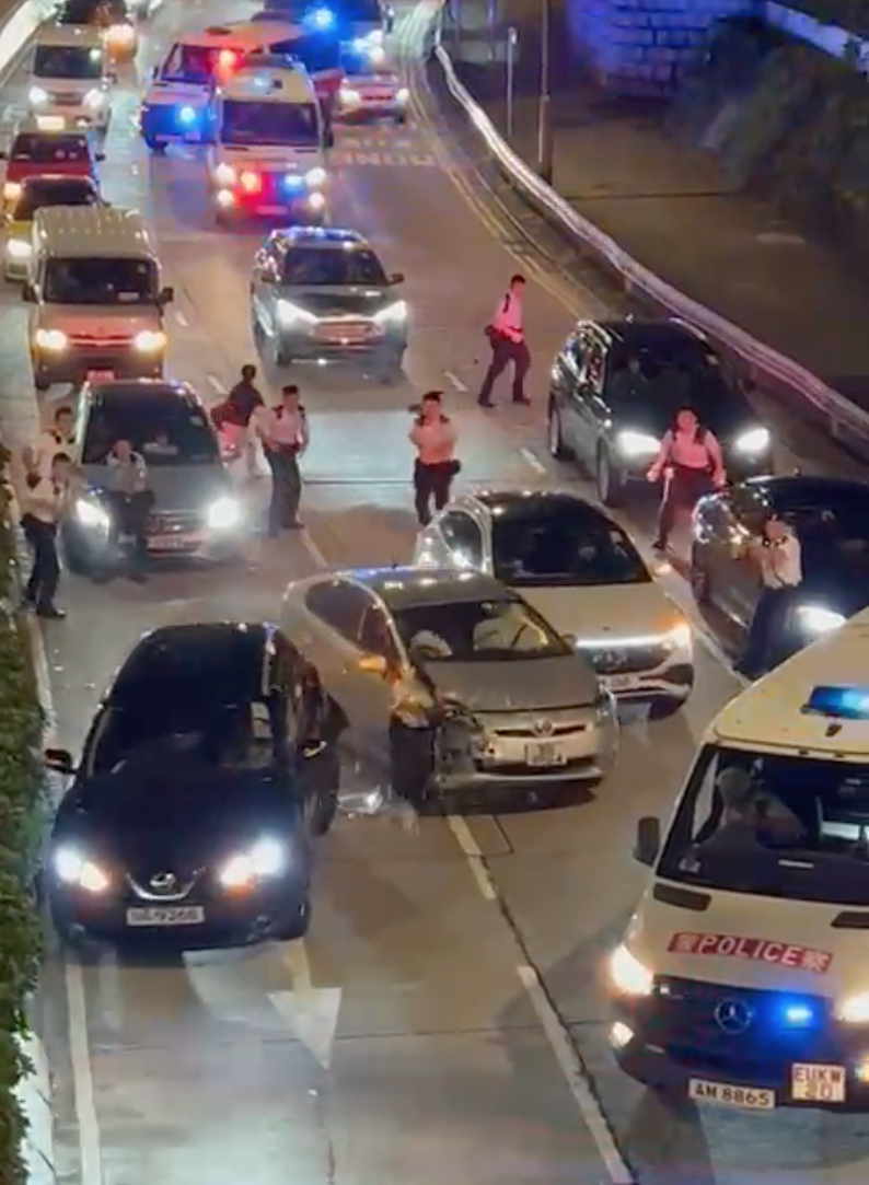 片段見到,當時有多部警車正追截一輛私家車,至近培正道時其中一輛警車車輛打橫攔在路中,與多輛私家車形成包圍圈,把涉事私家車重種包圍圍。