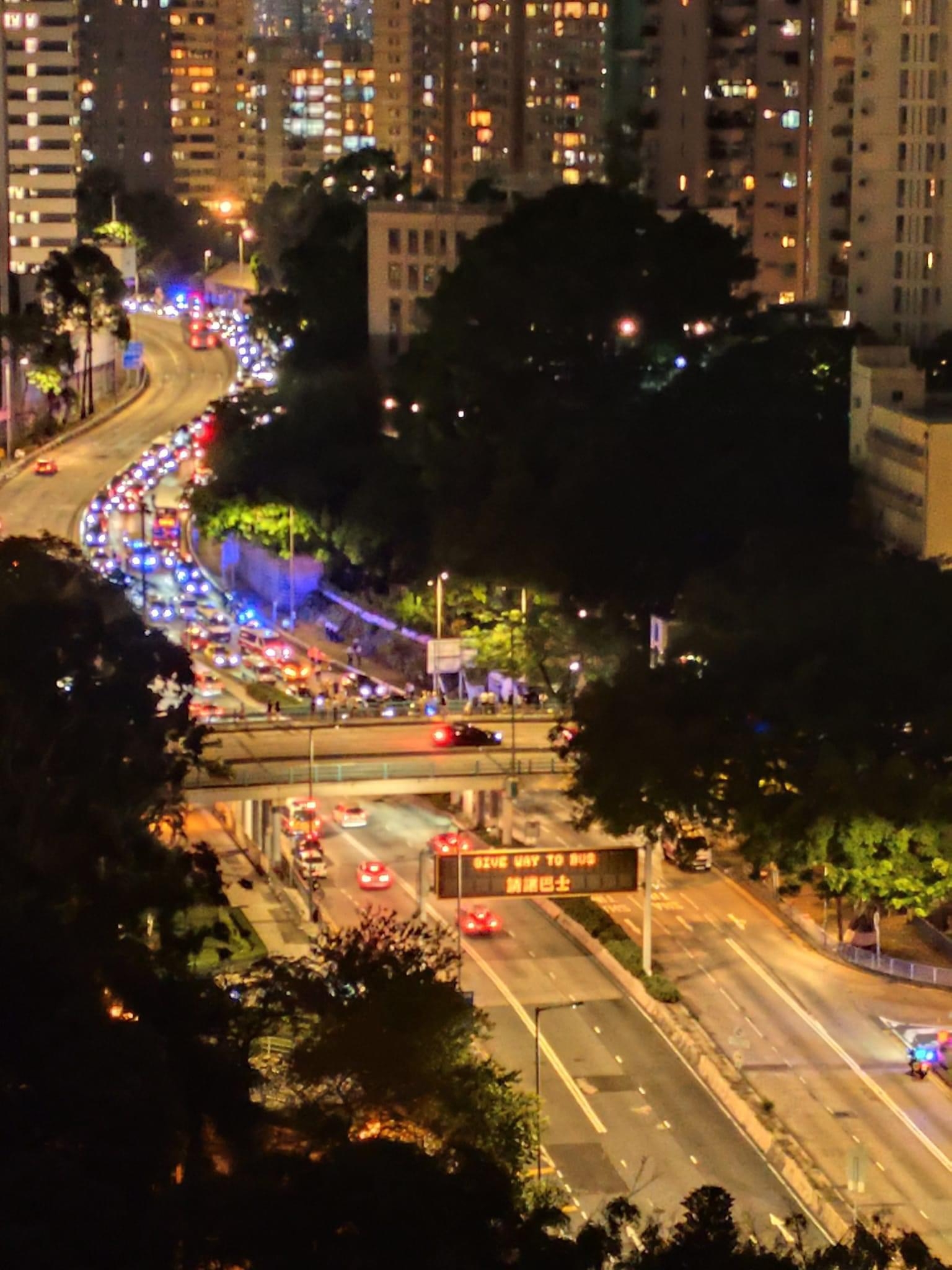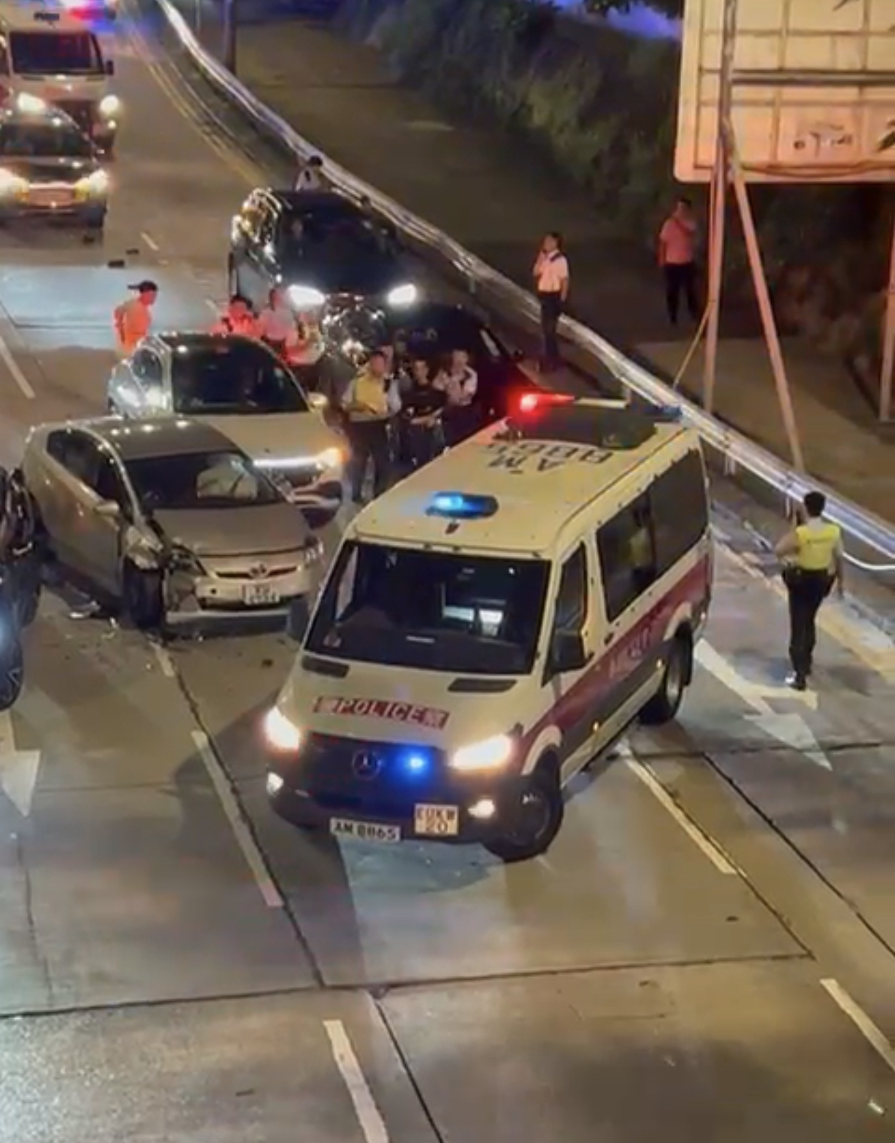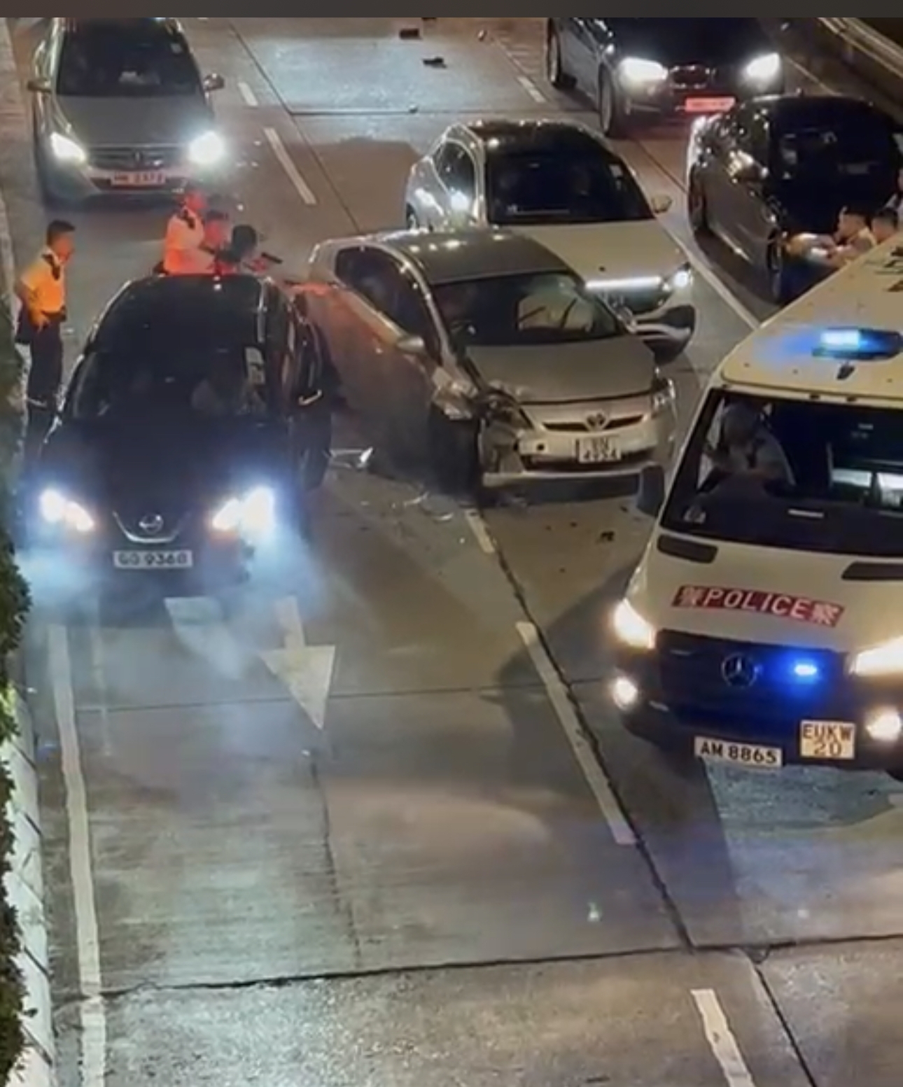 從片段見到,當時有多部警車正追截一輛私家車,至近培正道時其中一輛警車車輛打橫攔在路中,與多輛私家車形成包圍圈,把涉事私家車重種包圍圍。
