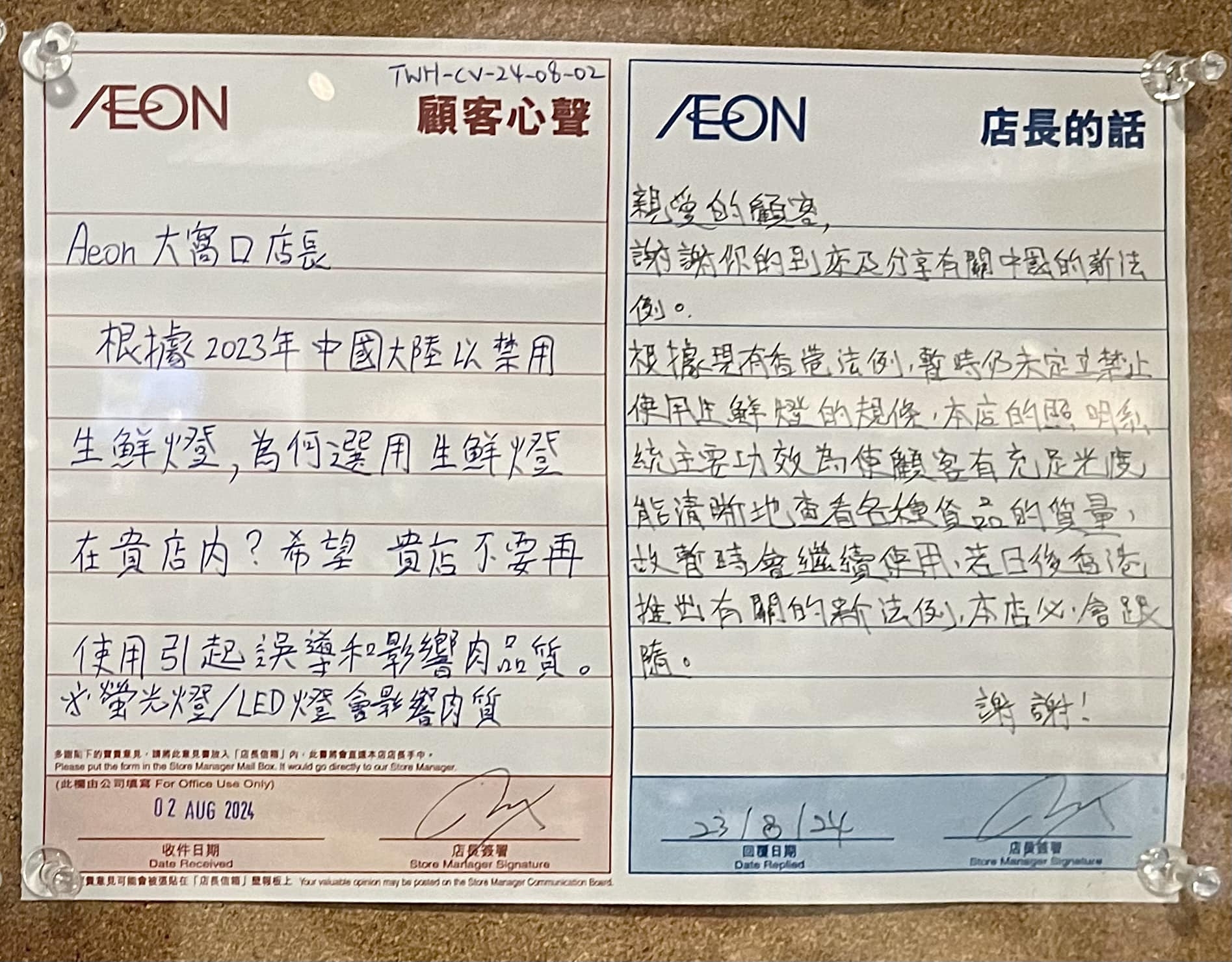 相片見超市店長親自回覆了該顧客,「謝謝你的到來及分享有關中國的新法例。根據現有香港法例,暫時仍未定立禁止使用生鮮燈的規條,本店的照明系統主要功效為使顧客有充足光度能清晰地查看各種貨品的質量,故暫時會繼續使用,若日後香港推出有關的新法例,本店必會跟隨。謝謝!」