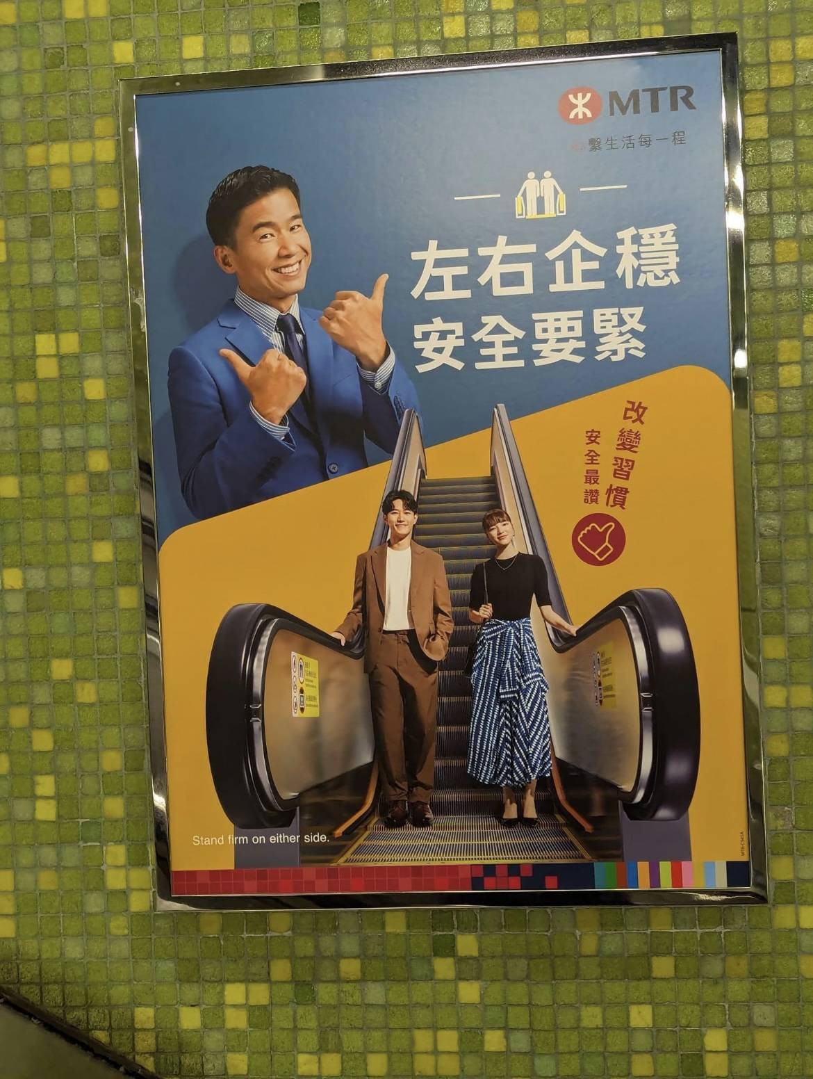 廣告中可見一男一女併立在扶手電梯上,廣告標語寫著「改變習慣,安全最讚」,並且說「左右企穩,安全要穩」,意思是乘客應該站在左右側,不建議乘客在左側通道行走。