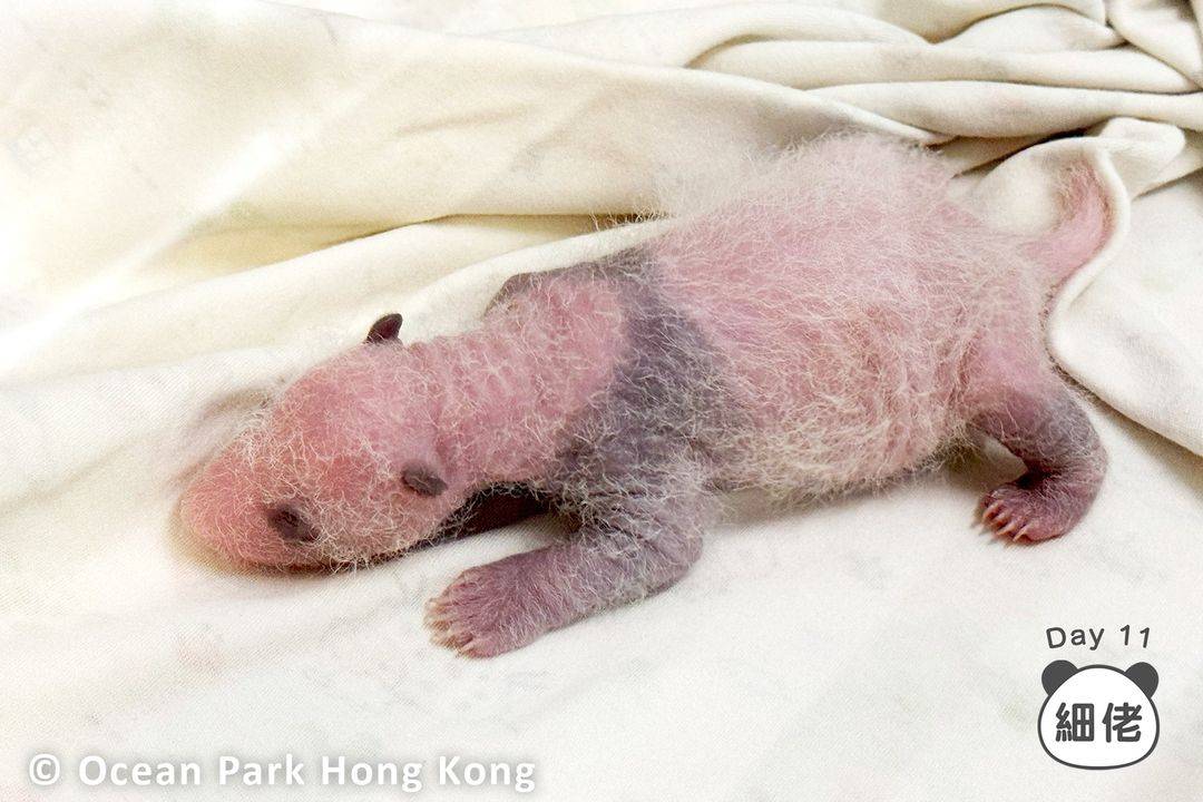 至於「細佬」方面,其熊貓特徵更明顯。出生第11日的相片,雙手雙腳更明顯已變成黑色,黑色背心更明顯,熊爪的指甲亦明顯有變長。