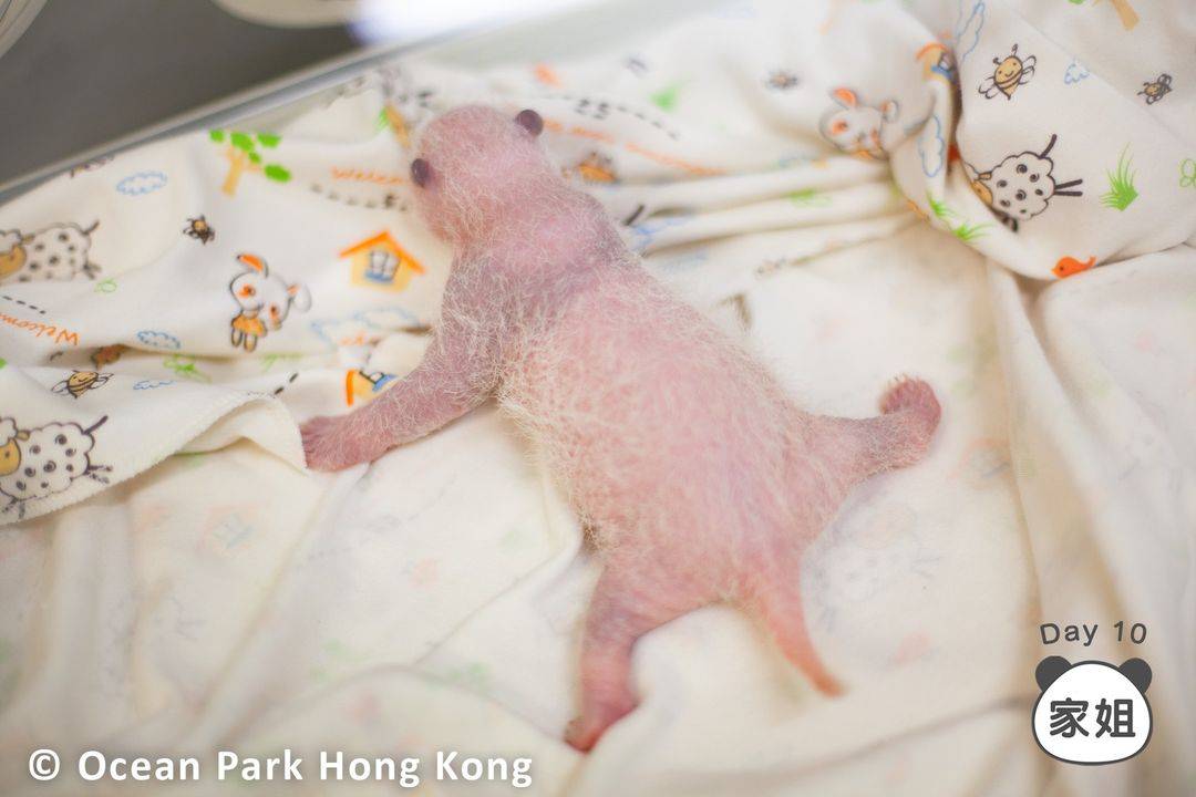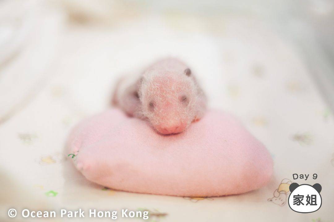 「家姐」第9日的相片是俯伏在粉紅色軟墊上,可以看到淡淡的黑色小耳和熊貓眼,而第10日的相片則變成「趴地熊」,當中雙腳和左邊小手向外伸展,可看到背部「黑色小背心」。