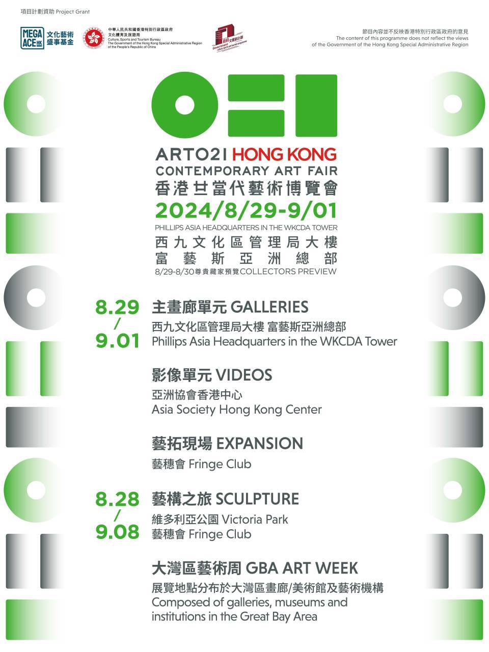 是次活動作為香港特別行政區政府文化體育及旅遊局「文化藝術盛事基金」的資助項目,旨在透過與全港多個標誌性藝術場所合作,打破常規藝術博覽會的模式與定義,為香港藝術帶來新的視野。