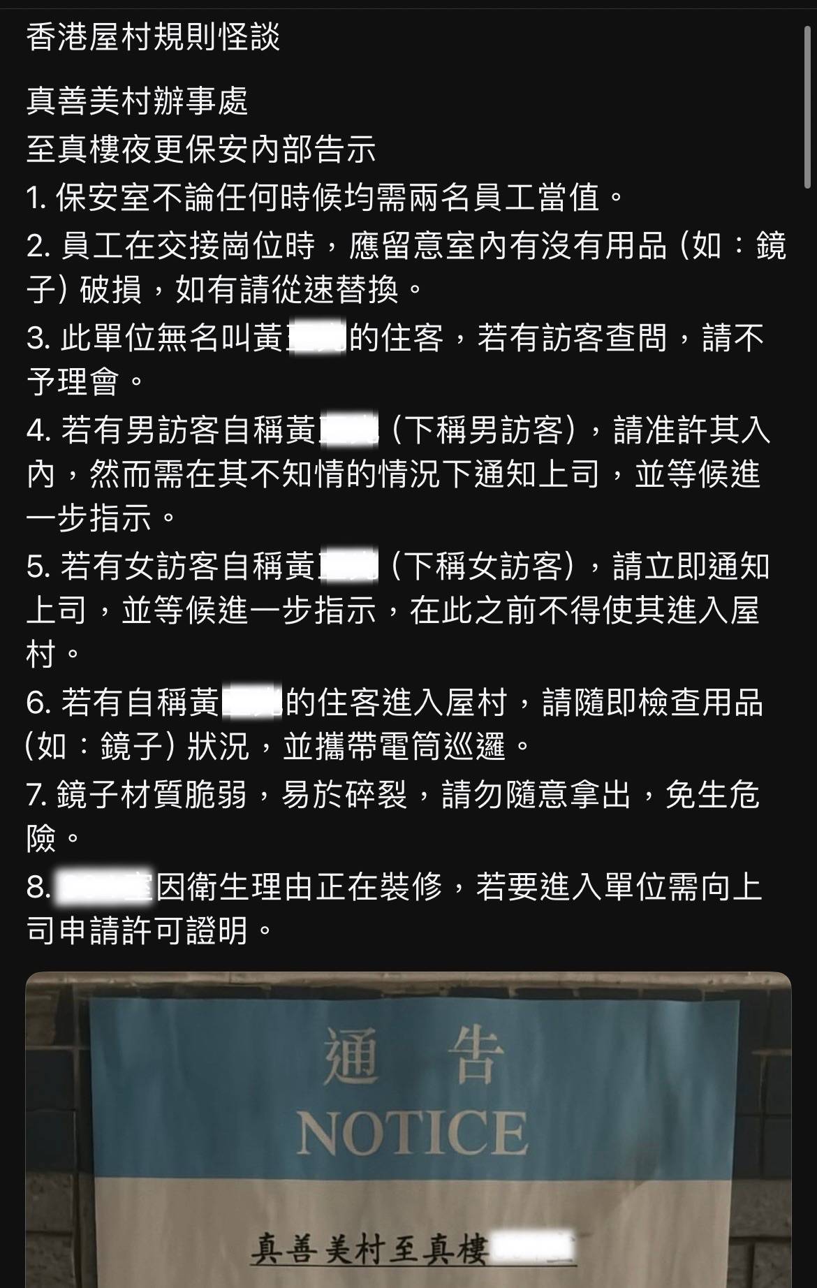 有網民在社交平台上載照片,是一張張貼在牆上的通告,寫著:「真善美村至真樓3XX室。請留意,此單位無黃x光住客。」看起來有著詭異並陰森的感覺。於是網民為此創作出香港屋村規則怪談,「訂下16條至真樓夜更保安內部告示」,令整個氣氛變得更加可怕。