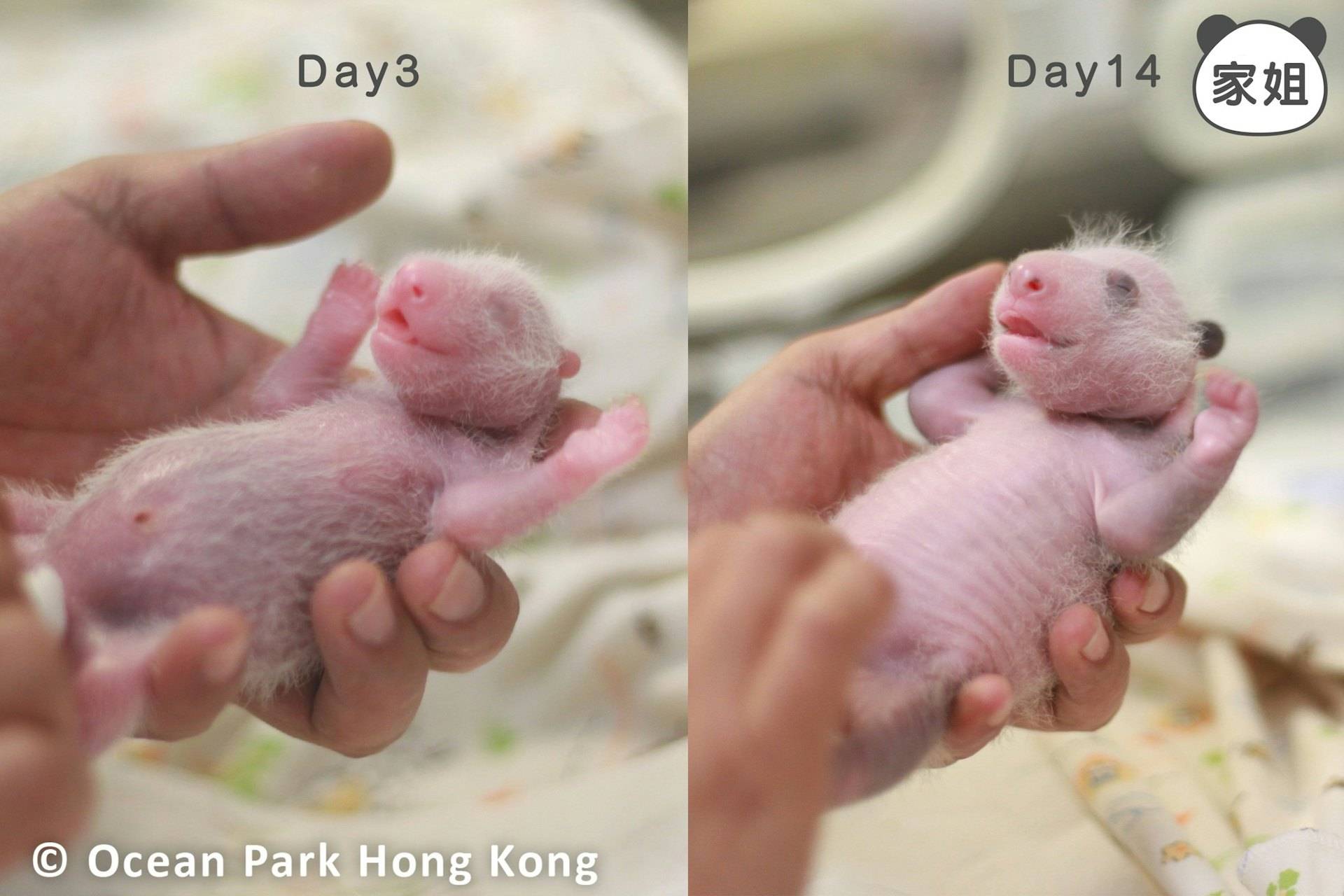 大熊貓盈盈一對大熊貓寶寶已經出生2周,香港大熊貓官方專頁今日(30日)再發布新貼文,稱是「大熊貓BB『上色』紀錄」,並貼出家姐和細佬第3天和第13或14天的照片,預計再過多兩星期、即大約在滿月的時候,身體便會被黑白色的皮毛覆蓋。