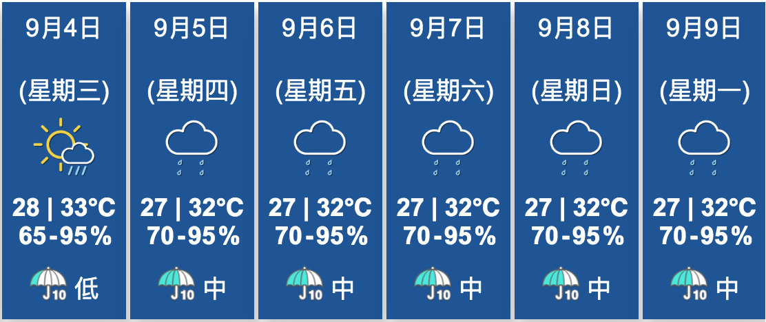 本港天文台九天天氣預報顯示,下周四(9月5日)起要暫時告別陽光,一連四日大致多雲,有幾陣驟雨,周五(9月6日)起更料有雷暴,最高氣溫料降至32度,但料吹東風4級,間中5級,並未見3號或更高風力預測(6級或以上)。