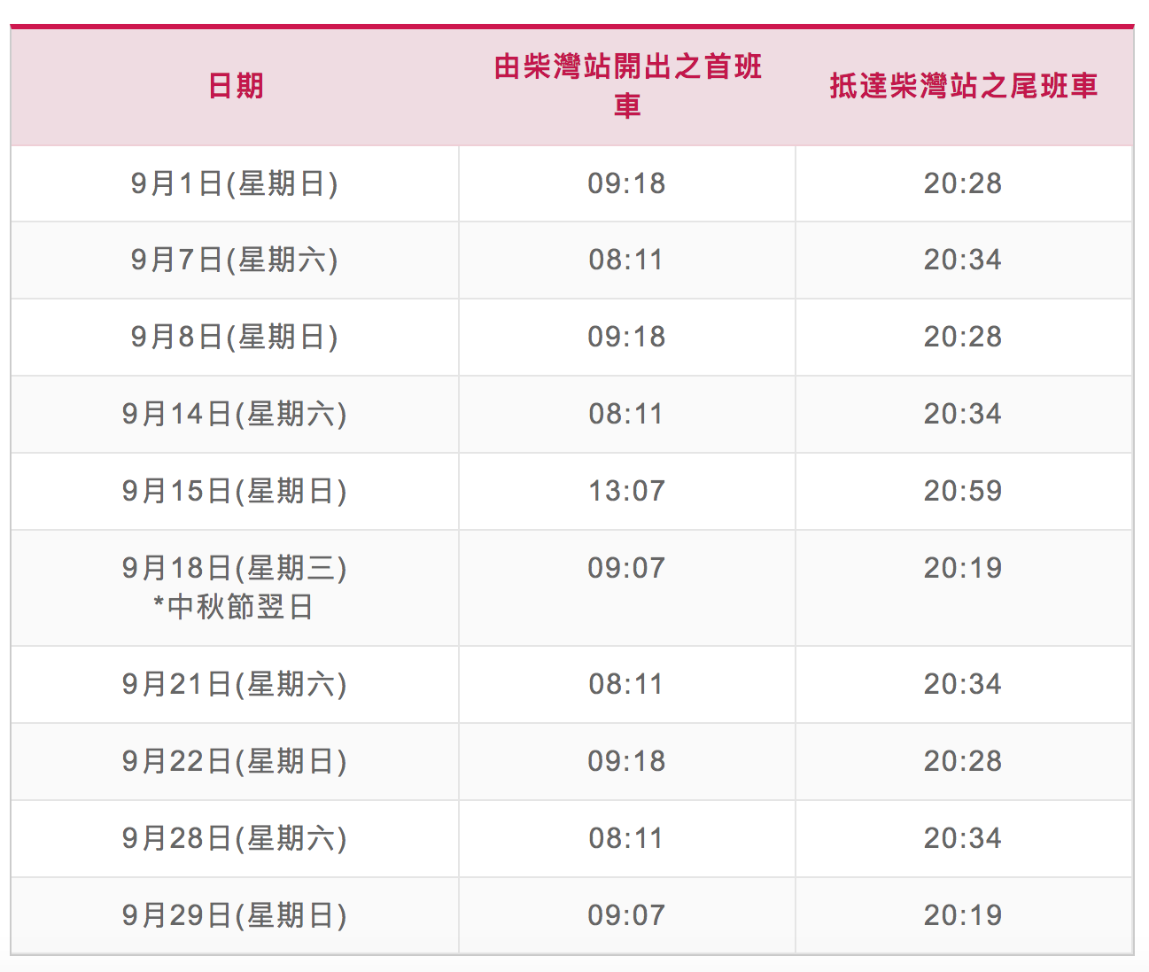行車時間表 (2024年9月1日至9月30日周末及公眾假期)