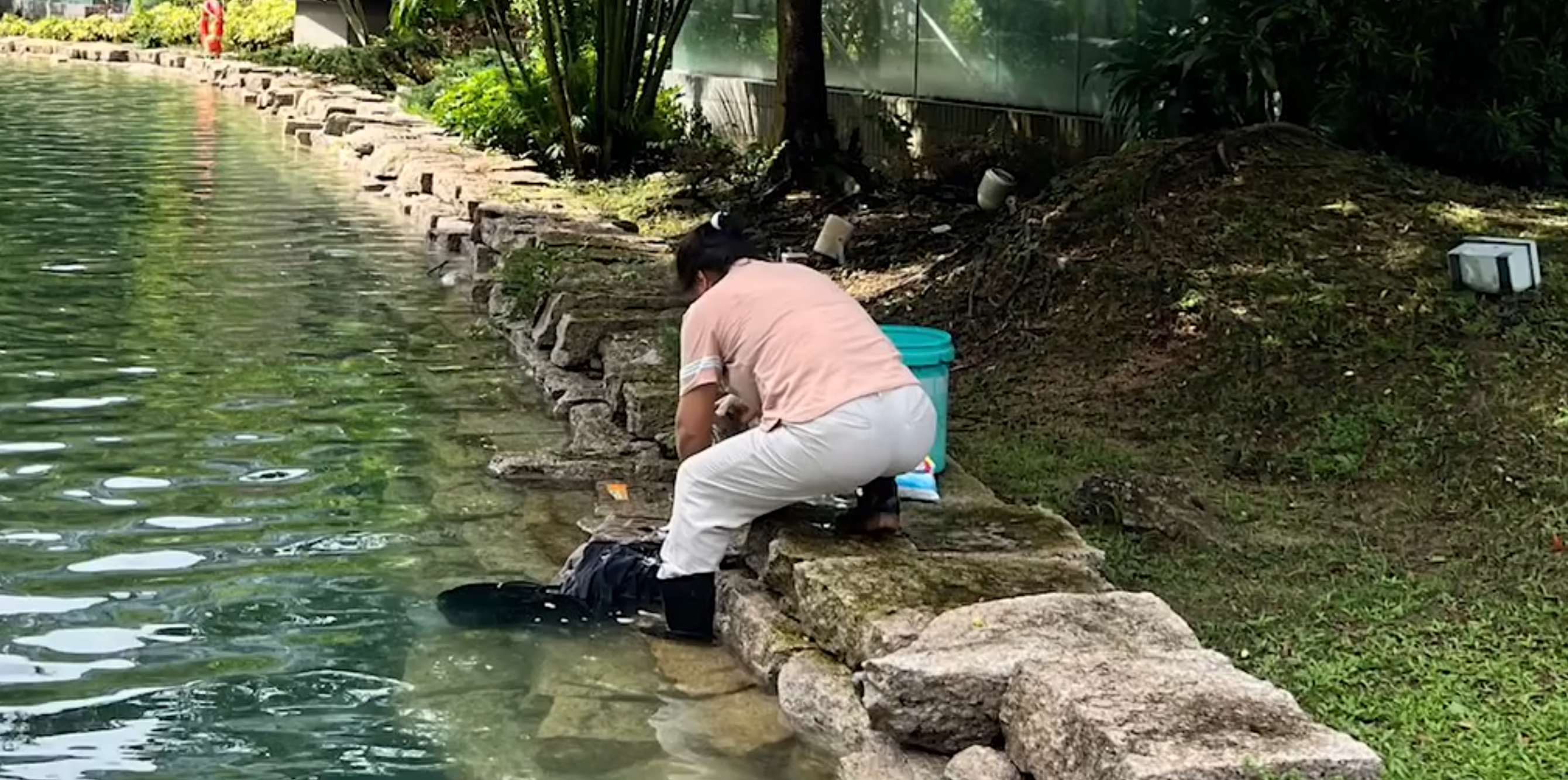 事發在剛過去的周日 (9月8日) 下午約3時,有人拍攝到一名「大媽」打扮的女子手持洗衣粉及洗衫板,相信在沙田科學園「金蛋」旁邊的噴水池附近洗衫,拍攝者笑言「以為返咗古代」,有網上留言調侃「風球過後的周日,清澈見底的池水最適合洗衫。」![]()