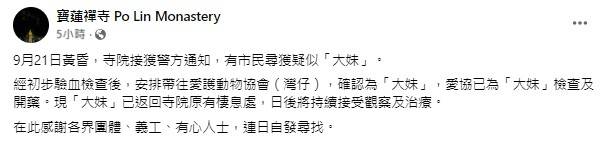 寶蓮禪寺懷疑以袋笠頭棄置唐狗「大妹」、「細妹」事件,正當公眾以為狗狗凶多吉少的時候,近日先後傳來好消息,早前尋回「細妹」之後,毛守救援義工昨午於東涌道尋回「大妹」,據稱狗狗身上晶片與「細妹」晶片均由同一人登記」,寺方出post 確認身份,並發放兩狗團聚相片。![]()
