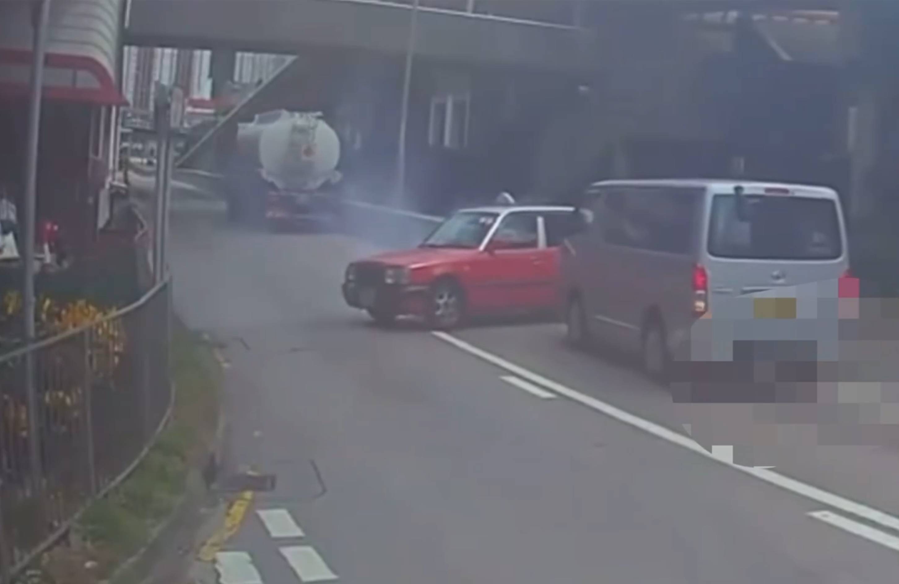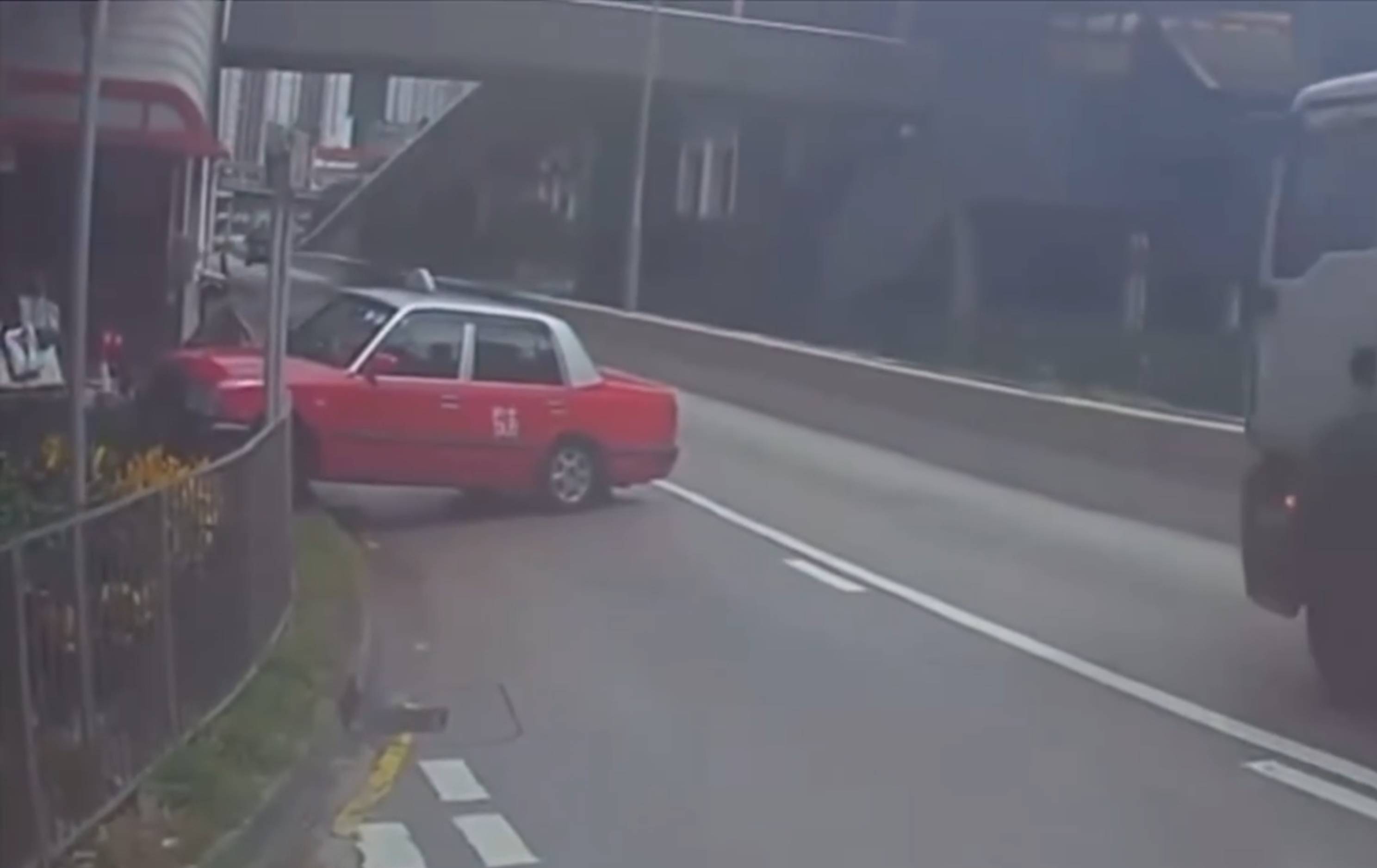 網上最新流傳一段的士司機懷疑爆胎後跣胎甩尾「自炒」的車Cam視頻,視頻中一輛紅色市區的士從讓路口慢速左轉入大路時,懷疑左邊尾胎爆胎後跣胎甩尾剷上左邊的石壆,及後該的士倒車脫險時再撞向右邊的石壆,一度影響運油車的去路,並且險些撞及沿大路行駛中的灰色輕型客貨車,最後的士司機駛到慢線一旁等待救援。