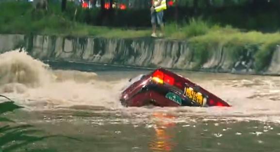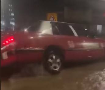 凌晨的片段所見,有的士卡在積水中,輪軚仍然空轉,當時水深已經掩至的士車頂,幸好的士司機及時逃生,但腳步受傷,由救護員陪同上救護車送院治理。另一相片所見,後來的士已經幾乎淹沒在漩渦中,載浮載沉,非常誇張!