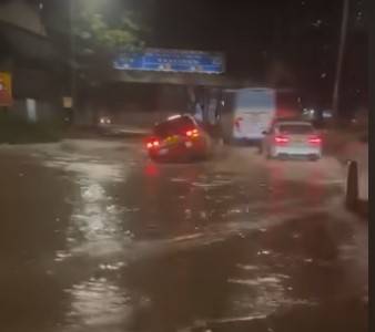 長沙灣荔枝角道往旺角方向近蝴蝶谷爆水管,一輛的士駛過時路陷,有片段拍下的士卡在積水的情況,非常驚險,幸好司機及時逃生。