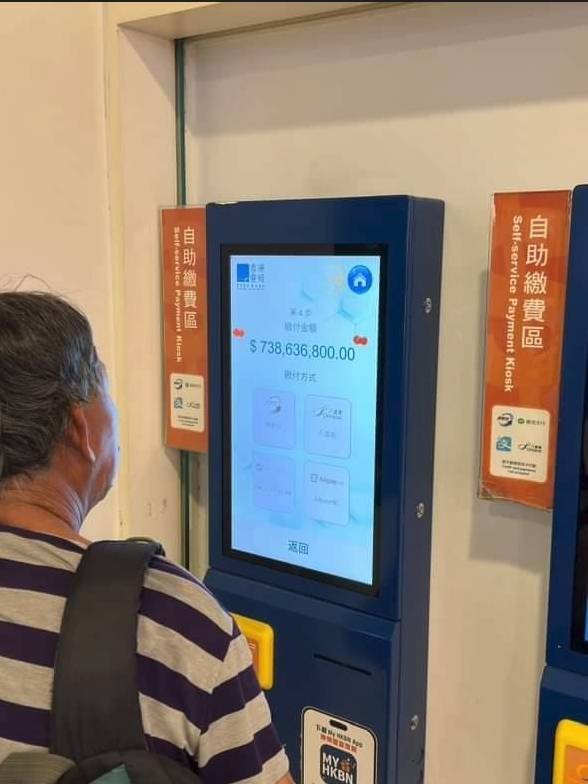 據了解,香港寬頻專門店內設有自助繳費機,用戶可以使用AlipayHK、WeChat Pay HK或八達通繳費,一名網民今日 (10月2日) 於社交平台Threads發帖文,稱前晚前往門店交上網及電話費時,發現排前面隊的一名阿叔竟要交超過7.38億元,屏幕可見繳付金額為「$738,636,800」。