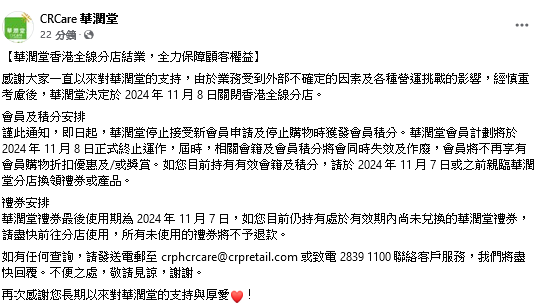 公司同時表示,即日起停止接受新會員申請及停止購物時獲發會員積分。華潤堂會員計劃將於2024年11月8日正式終止運作,屆時相關會籍及會員積分將會同時失效及作廢,會員將不再享有會員購物折扣優惠及/或獎賞,如客人目前持有有效會籍及積分,需於2024年11月7日或之前親臨華潤堂分店換領禮券或產品。