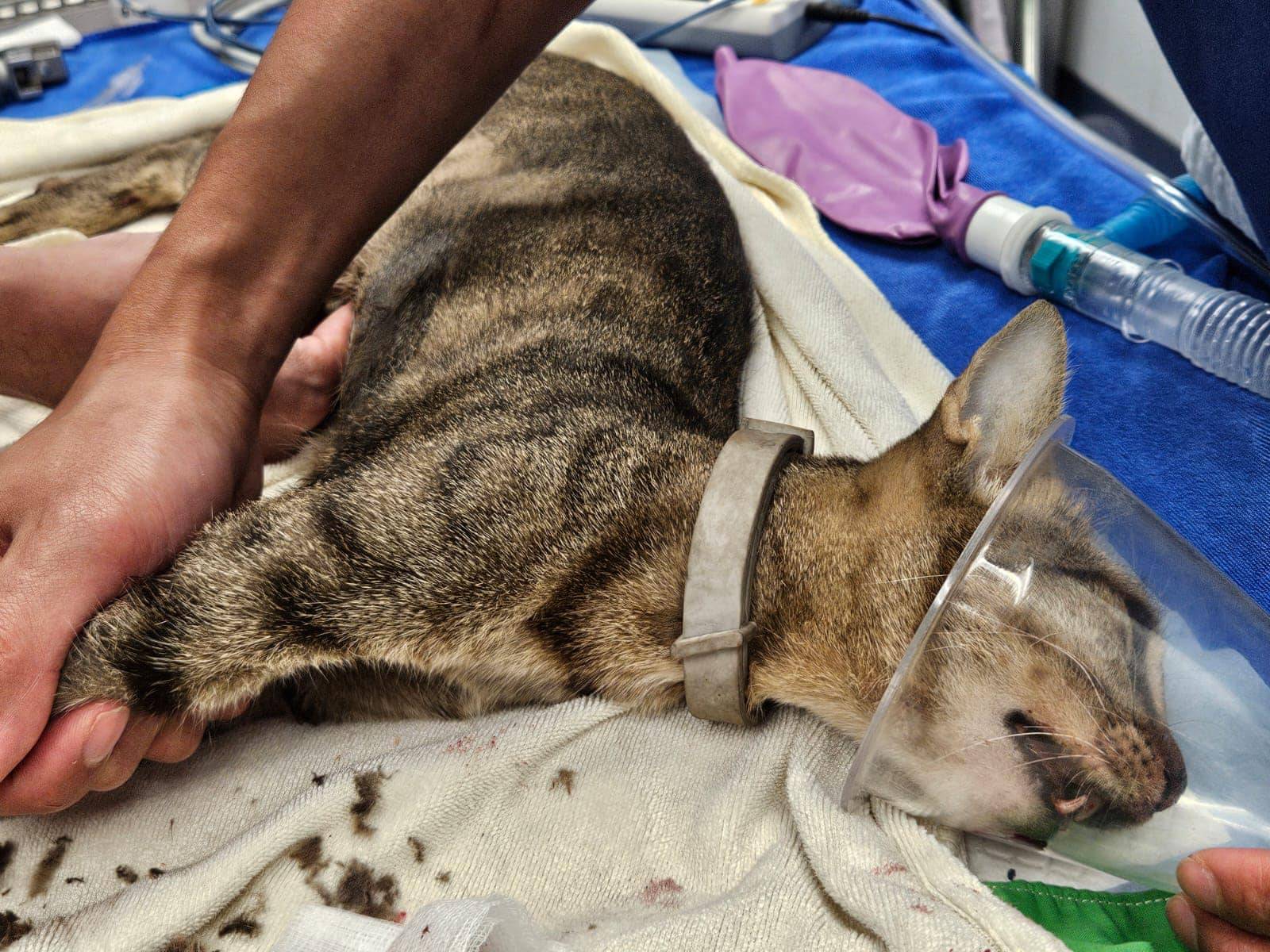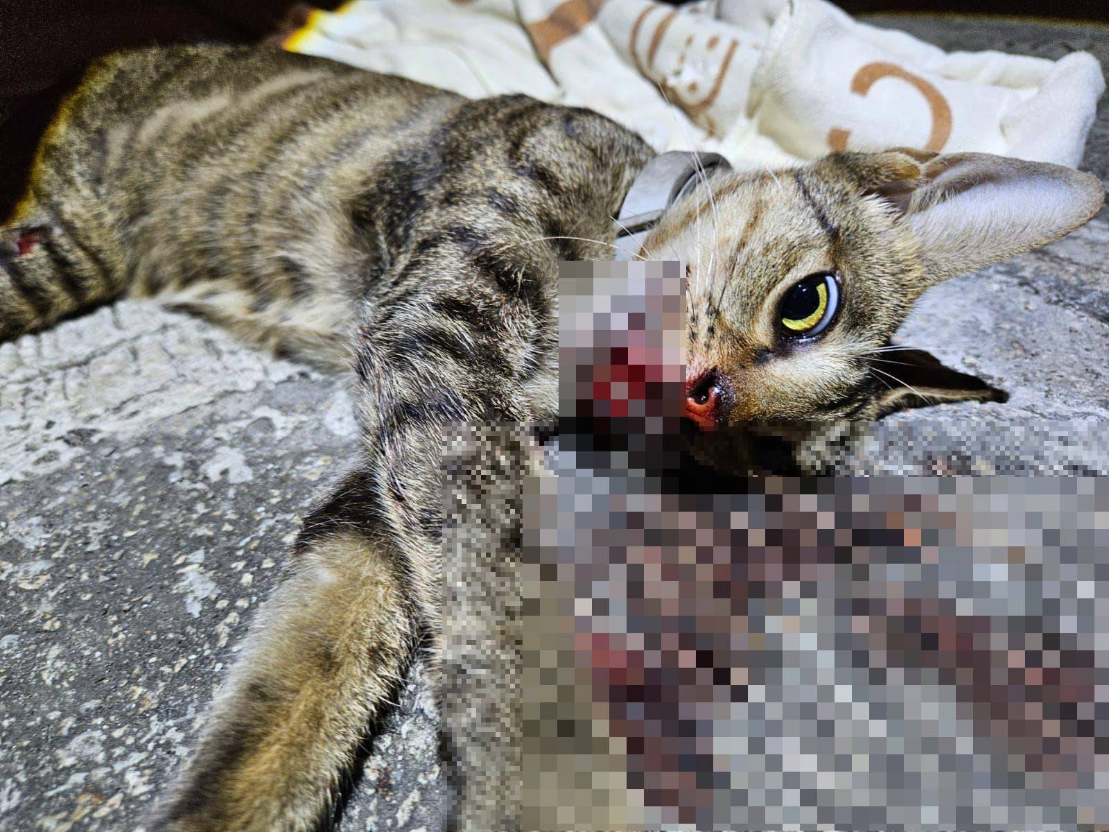 社交平台專頁毛守救援表示,昨晚(10月10日)九時半左右,有唐貓在錦田石崗菜站被一輛白色私家車撞到。受重傷唐貓為貓女,已經絕育及剪耳,頸有蝨帶。貓咪受傷後倒在馬路上,口鼻吐血,大腿有傷口及呼吸急速,情況嚴重,義工到場送院搶救24小時診所搶救。據影片所見,貓咪表情甚痛苦,地上亦留下大量血跡。