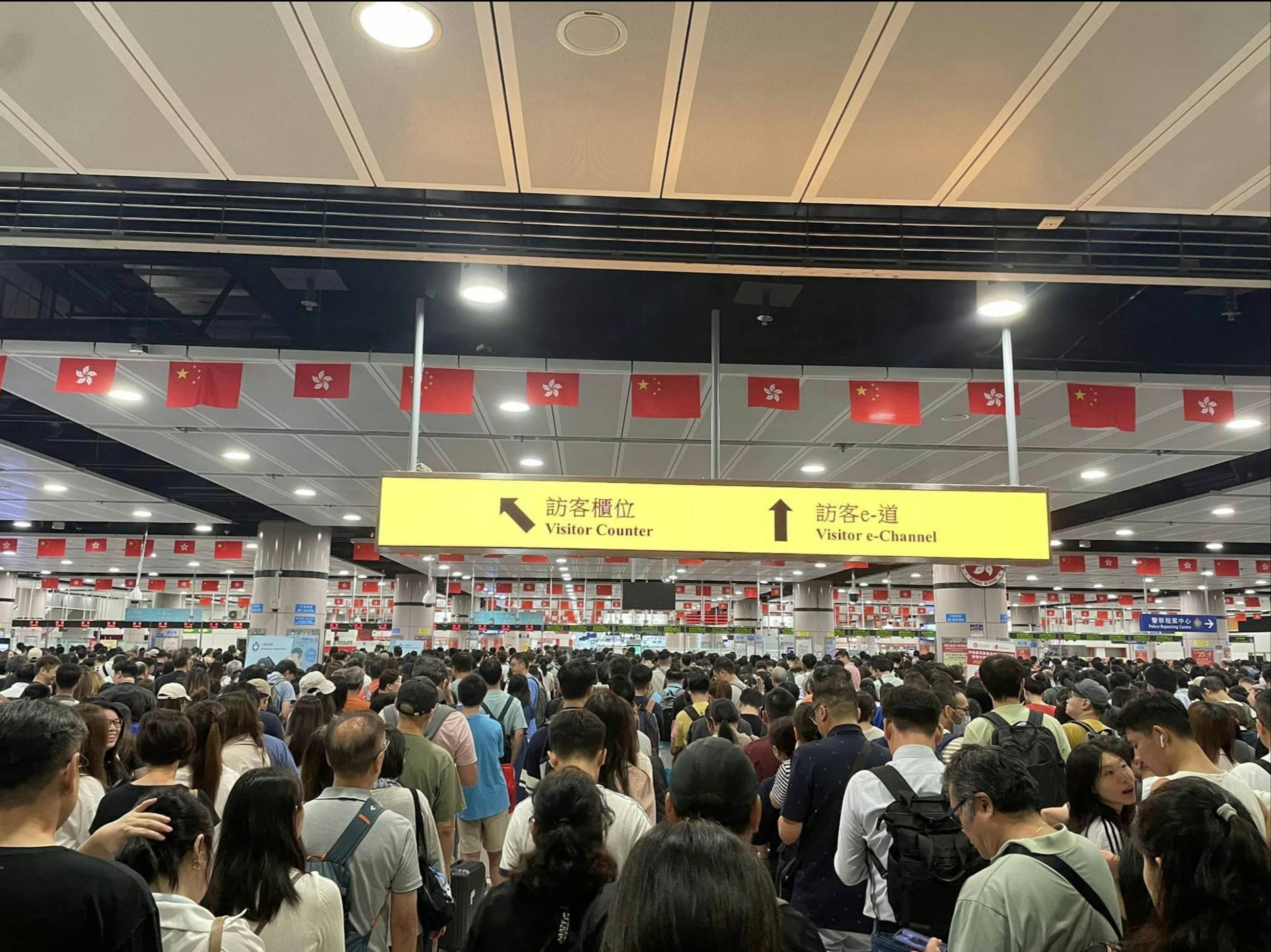 至於其他出境口岸同樣被迫爆,其中蓮塘口岸離境大堂外圍起鐵馬,市民需要排長龍等候,在離境大堂內則繼續塞爆等候過關;至於福田口岸離境大堂同樣有大批離港人潮。