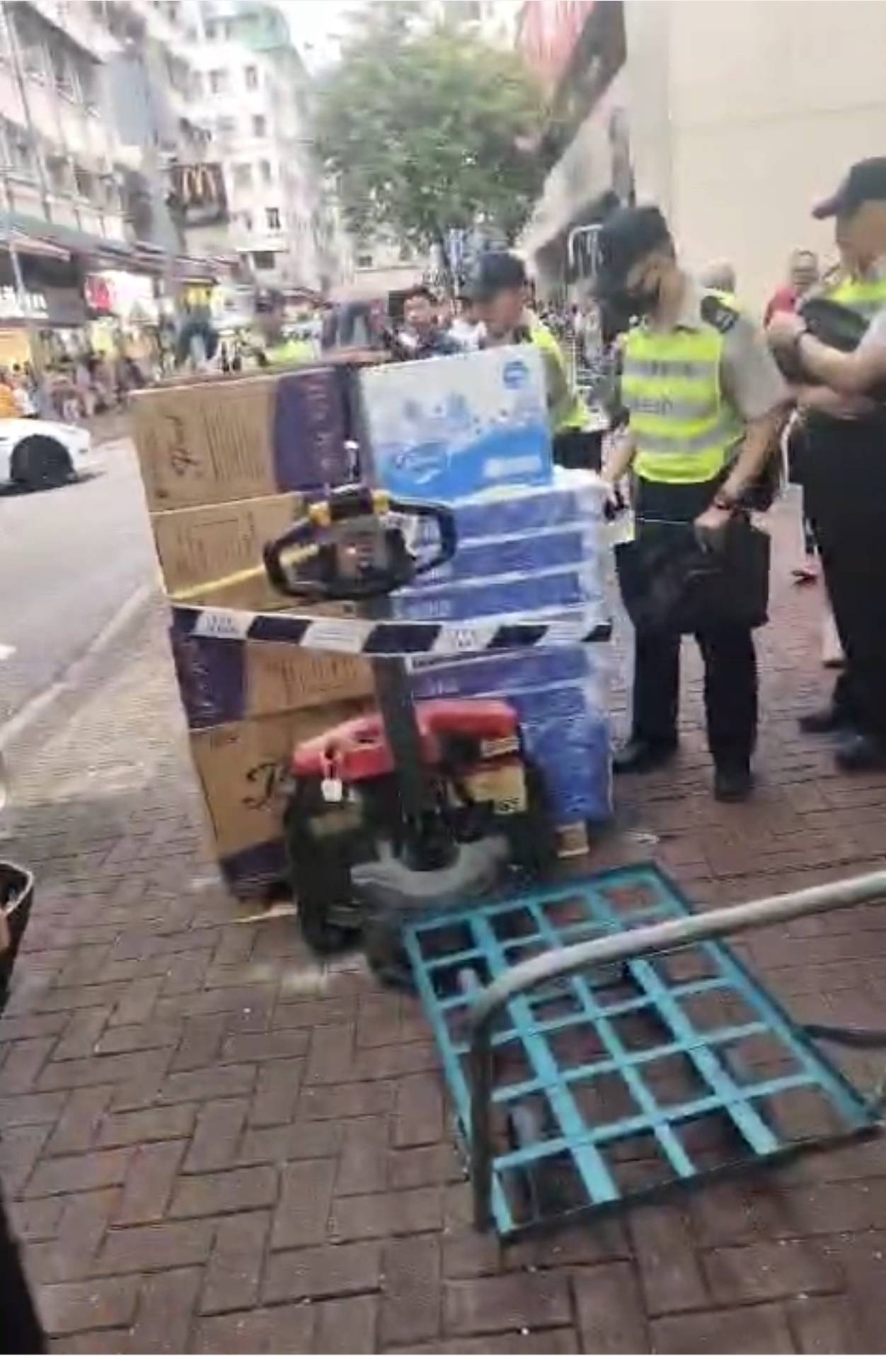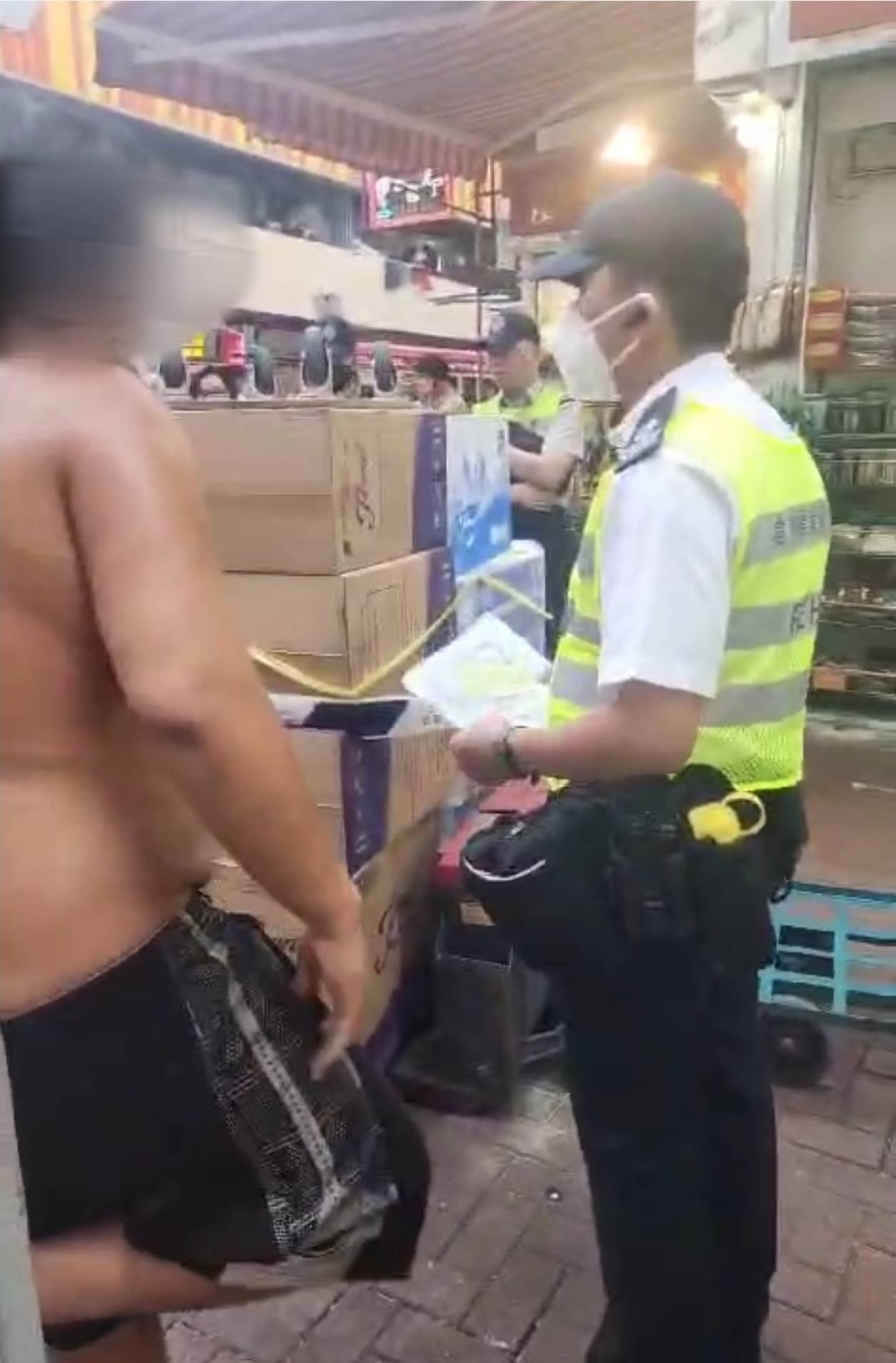 有市民在今天 (10月12日) 下午拍攝到食環署職員的執法行動,事發地點相信是荃灣區,視頻中顯示最少6名食環署職員正在執法打擊阻街,期間把一堆仍然停留在唧車上未卸下來的貨物圍封,一名没有穿上衣相信是唧車運輸工人的男子,疑不滿食環署職員的嚴厲執法行動,不時與食環署職員理論,並且表示食環署職員「無情講」及保留上訴的權利,視頻中有疑似目擊事情發生經過的其他人士,在視頻中表示「未卸貨唧車停街片刻便被控告」。