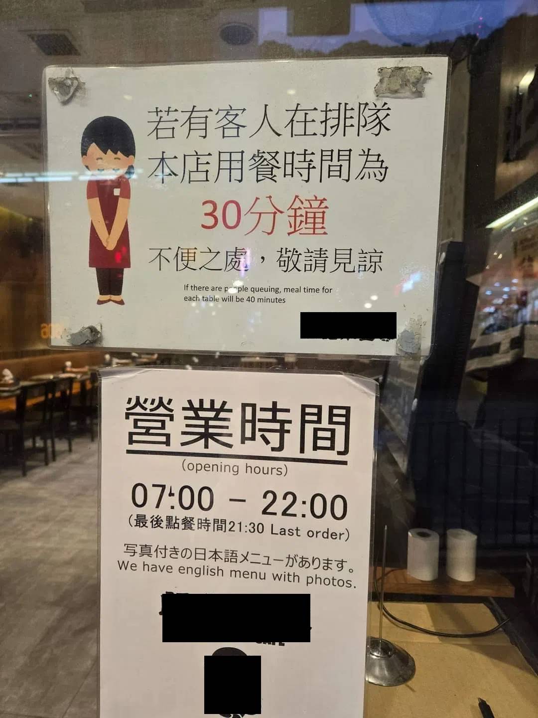 網上今天 (10月17日) 下午瘋傳一張相片,相片中一家餐廳疑似貼上一張告示,中文寫道「若有客人在排隊 本店用餐時間為30分鐘 不便之處,敬請原諒」,而同一張告示中,英文則寫道用餐時間是「40分鐘」,兩者有10分鐘的差距。