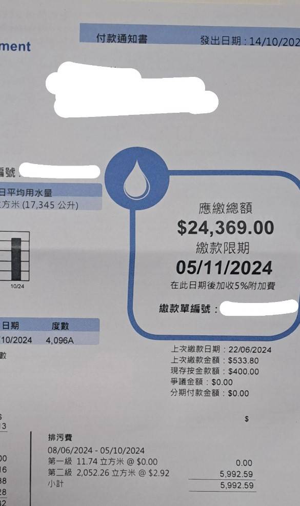 公屋4人家庭竟被收天價$2.4萬水費?一名網民日前在社交平台上發帖表示其住所水費需交2.4萬元,另附上水費付款通知書的照片。該網民指,自己1家4口住沙田區公屋,過往水費也只需500多元,不理解為何本期水費高達2.4萬元。從他上傳的照片可見,他上次繳款日期為6月22日,當時水費為533.8元;而10月份收到的水費單中可見住所每日平均用水量高達17,345公升,應繳總額為24,369元。