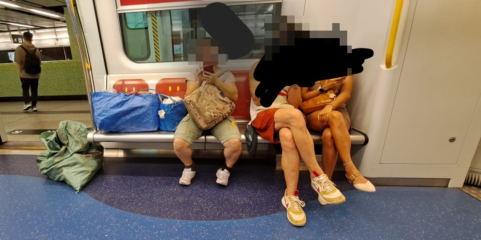 網上有人發文並附上一張照片,發文者寫上「地鐵包廂」,照片中可見一名人士在港鐵一列車廂的5座位乘坐時,佔用3個車廂座位,一旁的2個關愛座被放上兩個大袋,地上亦放置一個麻包袋,所飯位置甚至較一旁的情侶多。