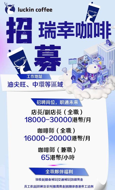 瑞幸咖啡香港招聘月薪1.6萬起