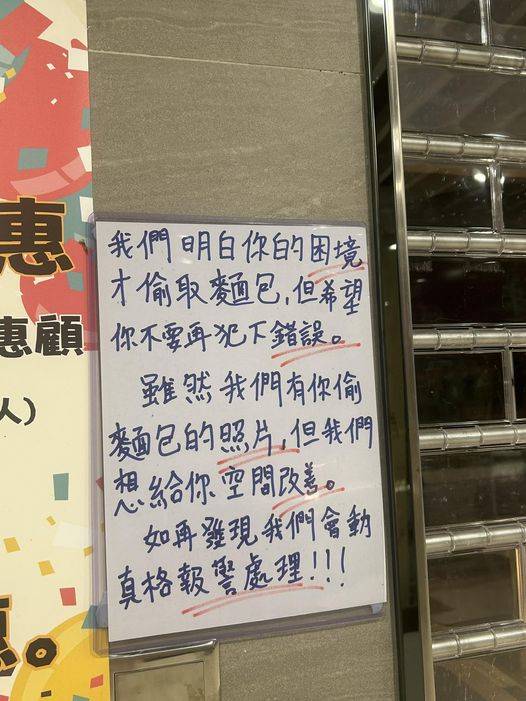 網上fb群組最新流傳一張相片,相片中慈雲山一間食店的白板寫上字句,大意是指發現並且拍下偷包賊的容貎,但有感目前香港經濟困難,因此宅心仁厚對待偷包賊給予機,希望賊人回頭是岸不再重犯,否則報警處理。
