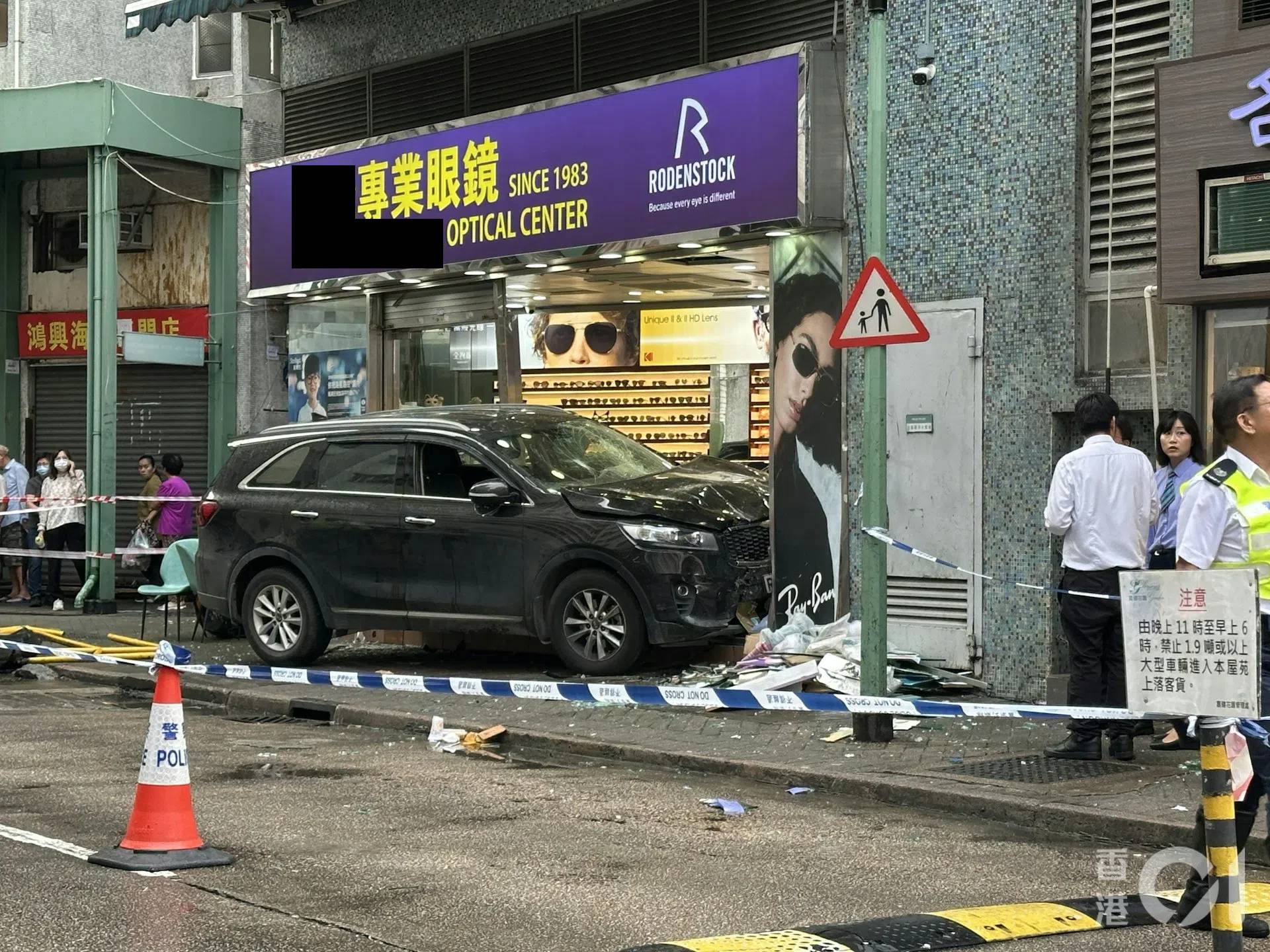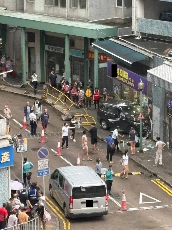 網上fb群組的現場圖片顯示,車內安全氣袋彈出,行人路的圍欄及垃圾桶被掃毀,一間眼鏡店的玻璃櫥窗被撞爛,店鋪入貨架亦倒下,玻璃碎散落一地。現場消息指,被撞的眼鏡店不久之前曾進行翻新裝修。