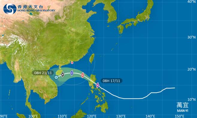同時,預料熱帶氣旋萬宜會於今晚至周一(11月18日)初時進入本港800公里範圍,並逐漸靠近華南沿岸,在東北季候風及萬宜的共同影響下,周一及周二(11月19日)該區風勢逐漸增強,天文台屆時會發出熱帶氣旋警告信號。