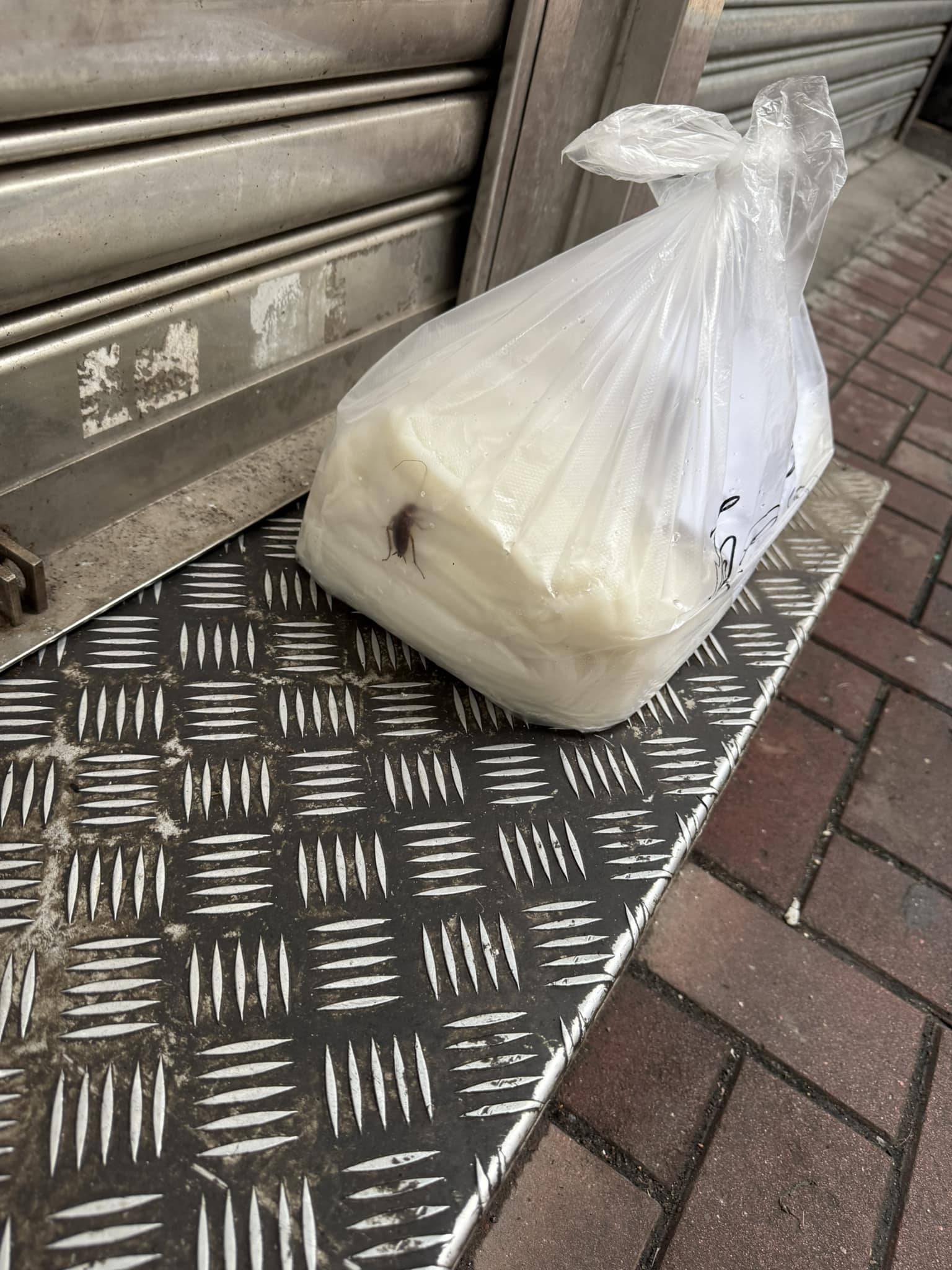 食物安全至關重要,日前網上社交平台有人發布一張照片,指大角咀一間餐廳的清早時份,疑因供應商太早來貨未有職員收貨,故將食材席地而放。據網民上載的照片可見,一袋白色的食材只有一個透明膠袋裝起,而一隻大曱甴就依附在食材上,非常嚇人。