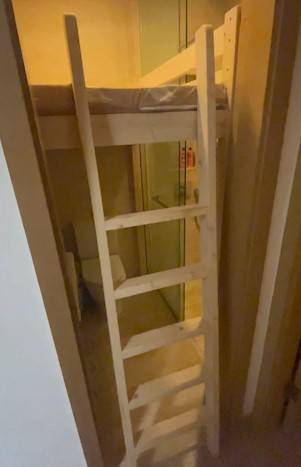 據影片所見,改造前,32呎的廁所有洗手盆、座廁和淋浴間,其後裝修師傅為改建有睡床的房間,在座廁上加建木製床架,變成148厘米長的碌架床、木樓梯放置床前,又將原有廁所門需拆除。下方仍是保留了原來的馬桶、洗手盆和「乾濕分離」淋浴間。