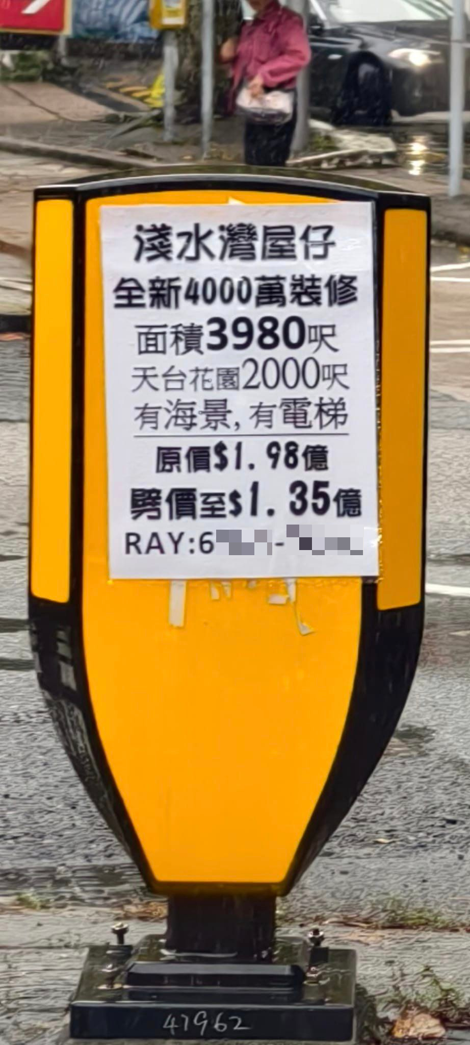 司機同時附有兩張照片,照片為一個樓盤的放盤宣傳單張,上面寫有「淺水灣屋仔,全新4,000萬裝修,面積3,980呎,天台花園2000呎,有海景,有電梯,原價$1.98億,劈價至$1.35億」,亦附有聯絡方法。從價錢上看,該盤應該為「銀主盤」(遭銀行收回物業,再於物業市場上出售)。